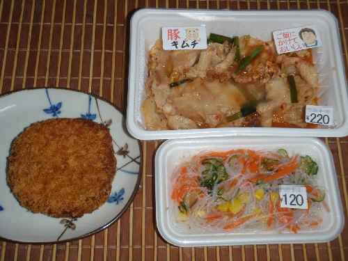 kuniさん一家が来福されたのは、彼のブログを観ると、もう1ヶ月前のことだ。関西からフェリーに乗って九州入りされたのは、某コンビニのお弁当を買うためだった。当日のkuniさんのブログにも書かれているが、俺も何度か寄ったことがある、コンビニというよりも、総菜屋さんに近いそのお店は、近々閉店してしまうらしい。同じ県内とはいえ、そのコンビニは家から50kmくらい離れているが、今日は夕方たまたま、仕事でそちら方面に行ったので、俺も閉店される前に、記念に寄ってきた。俺も晩飯用にお弁当を買おうかとも思ったが、今夜まで先日炊いたご飯があるので、総菜とファーストフードを買う。豚キムチ(220円)と自分では絶対に作らない春雨の酢のもの(120円)に、酒のアテ用にFF(ファイナル・ファンタジーではない)のハムコロッケというか、ハムカツというべきか。まずはハムカツ(90円)と、kuniさん来福時にいただいたちりめん佃煮をアテに呑む。総菜の他には、キャベツの千切りとプチトマトのサラダに、麩の味噌汁。豚キムチのパックに「ご飯にかけておいしい」とシールが貼ってある以上、ご飯に乗せて食わないとね。ところでこの似顔絵は、「まいうー」と言えと