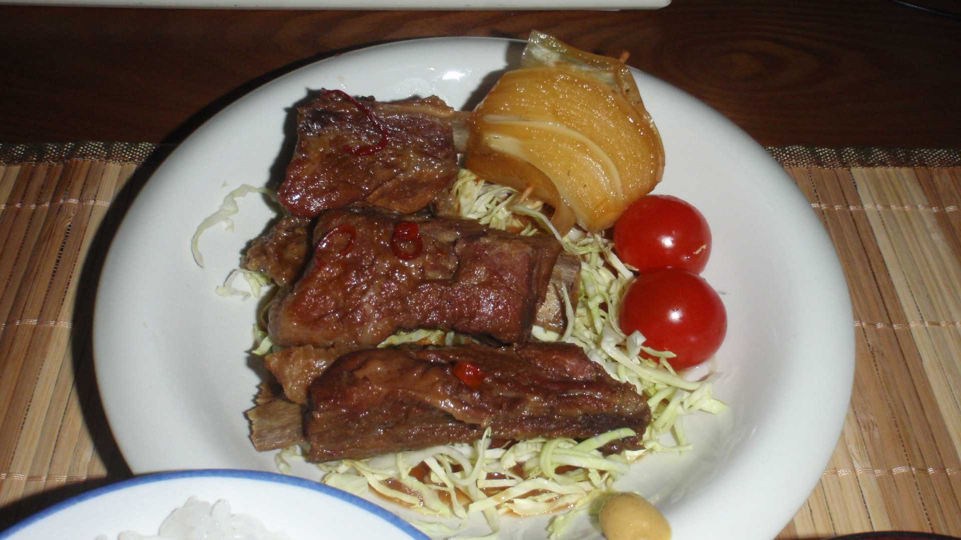 これは昨日作った料理だけど、今夜の分まで2食分を作ったので、昨日は触れずに茶を濁していた。そういうわけで、昨日豚のスペアリブを買って来て塩コショウを打ち、しょう油・酒・みりん・砂糖に鷹の爪で甘辛く煮込んだ。今夜は残りの半分を再加熱するが、ダブついているタマネギは今夜新たに切って、爪楊枝を刺し投入した。キャベツも角切りにして一緒に加熱する案もあったが、キャベツは千切りにして生のまま敷き、上にスペアリブを乗せ煮汁を掛けまわした。乾燥具を具に味噌汁を作る。