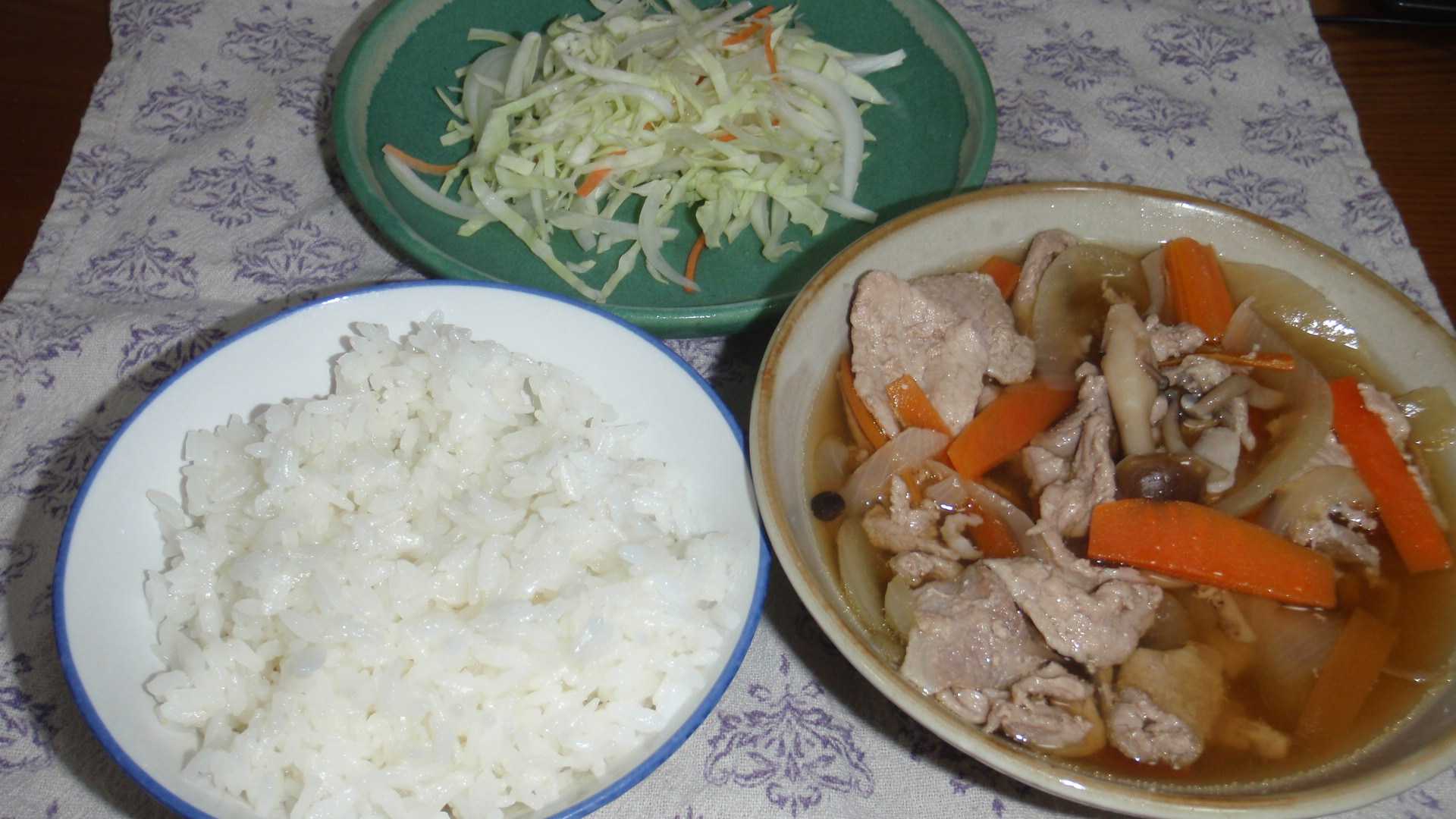 天気予報通り、あんなに降った雨も昼過ぎには上がった。今週は後1回14Km走ればいいので、週末まで引っ張らずに今日走れば楽になると心を切らさずに待っていた。結局今日は15Kmを走って、週のノルマをクリアした。今日は走ること優先で買い物には行っていないので、冷蔵庫の在庫で何とかしなければならない。豚肉の切り落としの在庫があるので、これをしょう油とみりんに砂糖で甘く煮込み、同じく在庫のタマネギ・ニンジンにブナシメジを加える。今夜は昨日炊いた冷蔵ご飯なので、これをご飯に掛けて丼ぶりも考えたが、量的に微妙だった(多かった)ので別皿に盛ってみた。牛丼店ではご飯と別盛の具は牛皿だろうし、ここにジャガイモが入っていればいっそ肉じゃがかもしれないが、これは丼ものにしてもよかった具材を別皿に盛ったので、豚皿というタイトルで。キャベツとオニスラにニンジンの生野菜を添える。本当は、走った日にそこまでは必要なく、サラダはそのまま冷蔵庫に戻る。