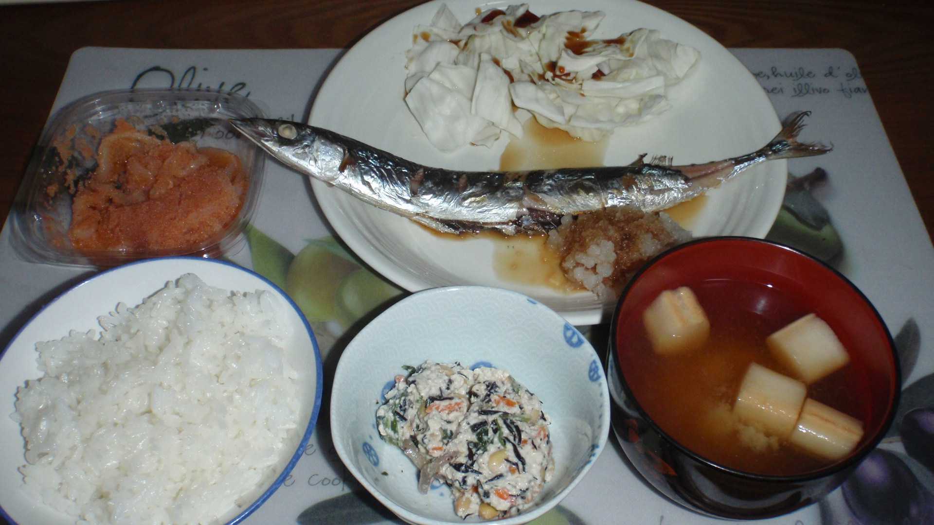 秋になったことだし? 魚を食いたいなと思いながら夕方スーパーへ行った。生さんまって8月中旬以降から店頭に並んでいたけれど、結構いい値段していたから見送っていた。時代が違うと言えばそれまでだけど、一尾300円を超えるさんまは手が出ないし、出来れば200円未満で買いたい。今日見たら頭を落とした一尾が198円(税抜き/以下同)・頭付きの2尾パックは380円で売られていたんだけど、どちらも細っ。こんなひょろひょろなさんまは食うところがない思いながら、さんまを見ると食いたくなる。でも、頭を落としてあるやつは買う気がしない。どうせ頭は食わないのに。ちょうど店員さんが表に出てきていたので「この頭付きを一尾で売ってくれ」と交渉したら、気持ちよく一尾パックにしてくれた。しかも値札を見たら、一尾価格の198円ではなく、2尾の1/2の190円だった。さんまを買ったら大根も必要だが、大根半本が結構大きい。さんまは小さいのに大根は大きいって、なんか上手くいかんものやな。魚焼きグリルをベランダに出して、さんまを塩焼にする。大根を下ろして、キャベツの角切りを添える。焼き魚には味噌汁も必要と麩を具に作る。酒のアテに買って来た総菜のほうれん草の白和えがあったが、酒は使いかけのバタピーで飲んだので、ほうれん草の白和えもおかずに参戦。