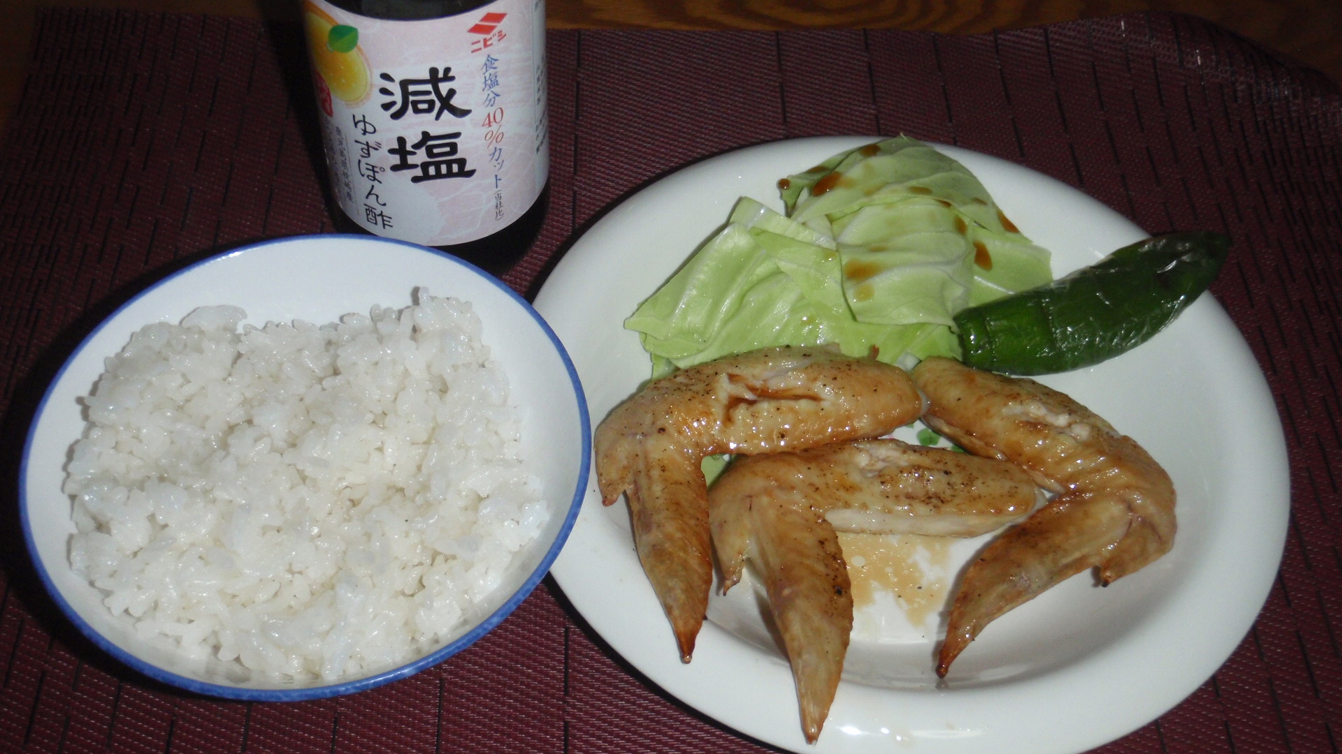 雨は午前中で上がるとの予報だったが、昼からも晴れたかと思えばまた雨が降る状況だった。それでも夕方には上がったと思っていたので、18時過ぎに走ろうと家を出たら、まだ少し雨が降っていたのには驚いた。年末に向かって車は多くなる一方で、しかも暗くなった時間の雨は危ないので、近所の一周1Kmの公園を10周しようかとも考えたが、さすがにそれはテンションが上がらない。まあ、10Km(正確には1時間)ならばなんとかなるだろうと、街をスクエアに走る。雨の日のグレーチングなどは滑りそうで怖いので、若干注意しながら走ったからなのか、単に俺がイケていなかったのか、今日は先週よりも3秒/Km遅かった。ドンマイさて、夕方スーパーに寄って、なんのプランもないままさまようが、鶏手羽3本入りのパックを見つけて、そうそうこのくらいの量がちょうどいいとかごに入れる。イメージ的には塩焼きだったので、角切りキャベツも欲しいよねと、思い切って1/4個で100円程度のキャベツを買う。1/4個で100円って一玉換算ならば400円だよ、恐ろしい。イメージ的には塩焼きと書いたが、明日が月に一度の通院日で、血圧を測られることを思い出したので、走った後に鶏手羽に切れ目を入れて、コショウだけ打って酒を飲む。酒を飲む前にキャベツも角切りにしたが、スーパー側も野菜が高い中で少しでも嵩ましして、使えなさそうな外葉を付けっぱなしで並べている。家にウサギや小鳥でもいればキャベツの外葉も重宝するのだろうが、残念ながら猫しかいないので外葉の2枚くらいは処分した。それでもこのありさま。青物野菜が安い時ならば、下手したらすべて処分していた部分。鶏手羽は魚焼きグリルで焼くが、ピーマンがもう1個残っていたのでついでにその半分を焼いた。皆さん鶏手羽は塩焼きだろうとお思いだろうが俺にも事情があるので、鶏手羽もキャベツもピーマンも、すべての味付けを減塩ポン酢でまかなう。