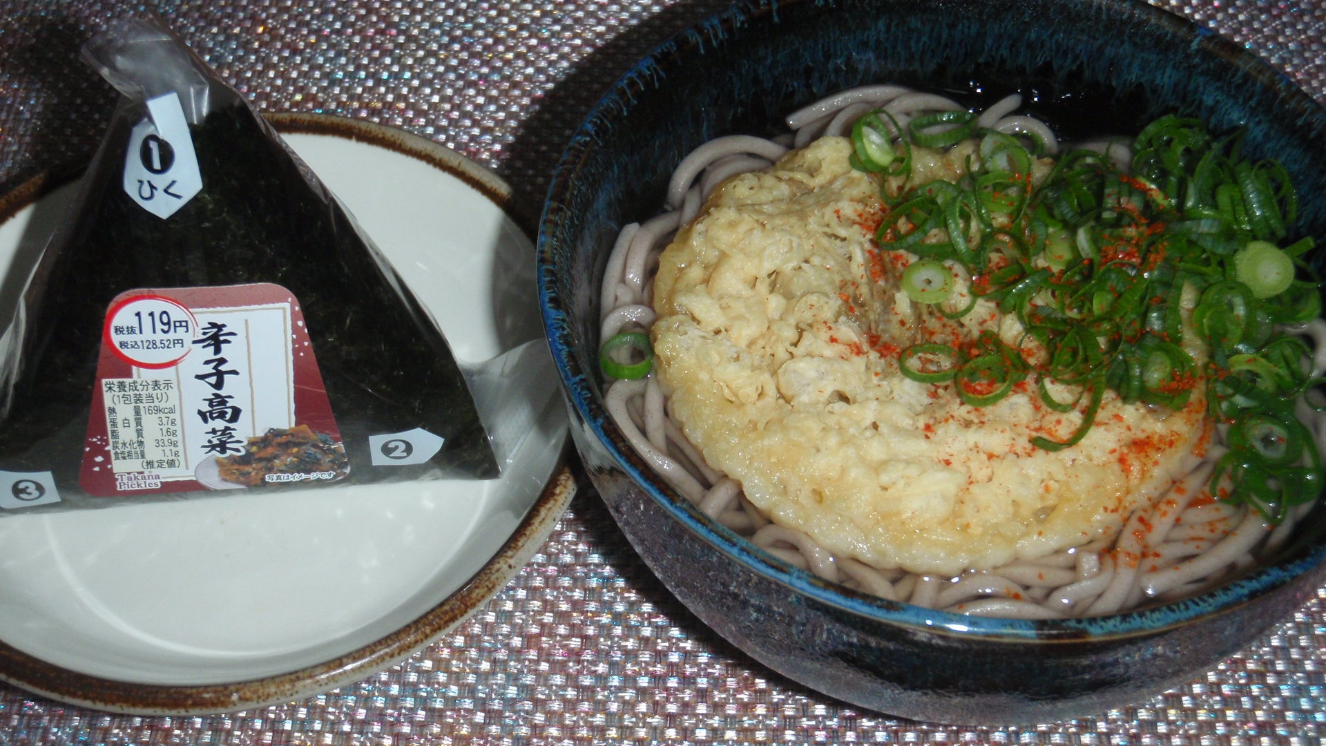 年末なのでいつもは暇な俺も多少は忙しい。今日も帰宅が遅くなったが帰宅途中の渋滞中に、ちゃんとサイドブレーキを引いてからスマホのウォーキングアプリを見たら(完全停車中は違反ではない)、あと7,000歩も歩かなければならなかった。7,000歩ってちんたらしていたら1時間半くらいは歩かなければならず、暗くなった寒い中を歩くのはつらい。今週は明日から走ろうと思っていたが、1時間半も歩くよりもその半分の時間で7Km走った方がましだ。ということで、慌てて着替えて走りに行く。せっかく着替えて走りに行くのだから、本来は週初めは21km走らなければならないが、それはさすがに無理だとしても、週のノルマの1/4の10.6kmは走っておきたい。と思ったが、晩飯の用意を何にもしておらず、家を通り越してスーパーまで走ったので結局12Km走ってしまう。そのままスーパーに飛び込んで買い物をするが、走り終えててすぐのまだ息が上がっている状況では、たいしたものは食えそうにない。そこで生麺のそばとごぼうの天ぷらにカットネギを買って来た。こちらではうどん・ちゃんぽん・焼きそばの生麺は39円(税抜き)程度で売られているが、そばの生麺は倍の78円(税抜き)もした。それでもうどんではなくて、今日はそばが食べたかった。なぜかと考えたら、あと一週間もしたら日本中でそばを欲する日だからね。だし汁は料理白だし10ccで起こした。今夜はご飯を炊くまでのことはないので、スーパーでついでにおにぎりを買おうとしたのだが、時間が遅かったので1個売りのおにぎりは2個しか残っていなかった。一つは具が昆布で塩分相当量が1.4gあり、もう一つは辛子高菜で1.1g表示だった。もちろん辛子高菜のおにぎりを買う。酒のアテもないので一緒に選ぶが、当然走った直後にはから揚げ等の油物は食えそうになく、総菜のポテサラを買う。キャベツがもう少しあったので角切りにして、ポテサラと角切りキャベツが今夜の酒のアテ。今夜は野菜がここにしかないもので、いちおう野菜も食いました的なアピール。
