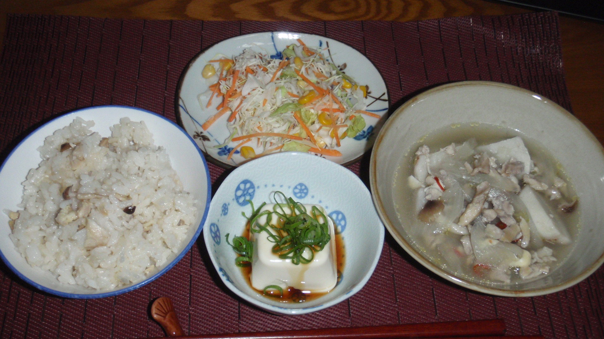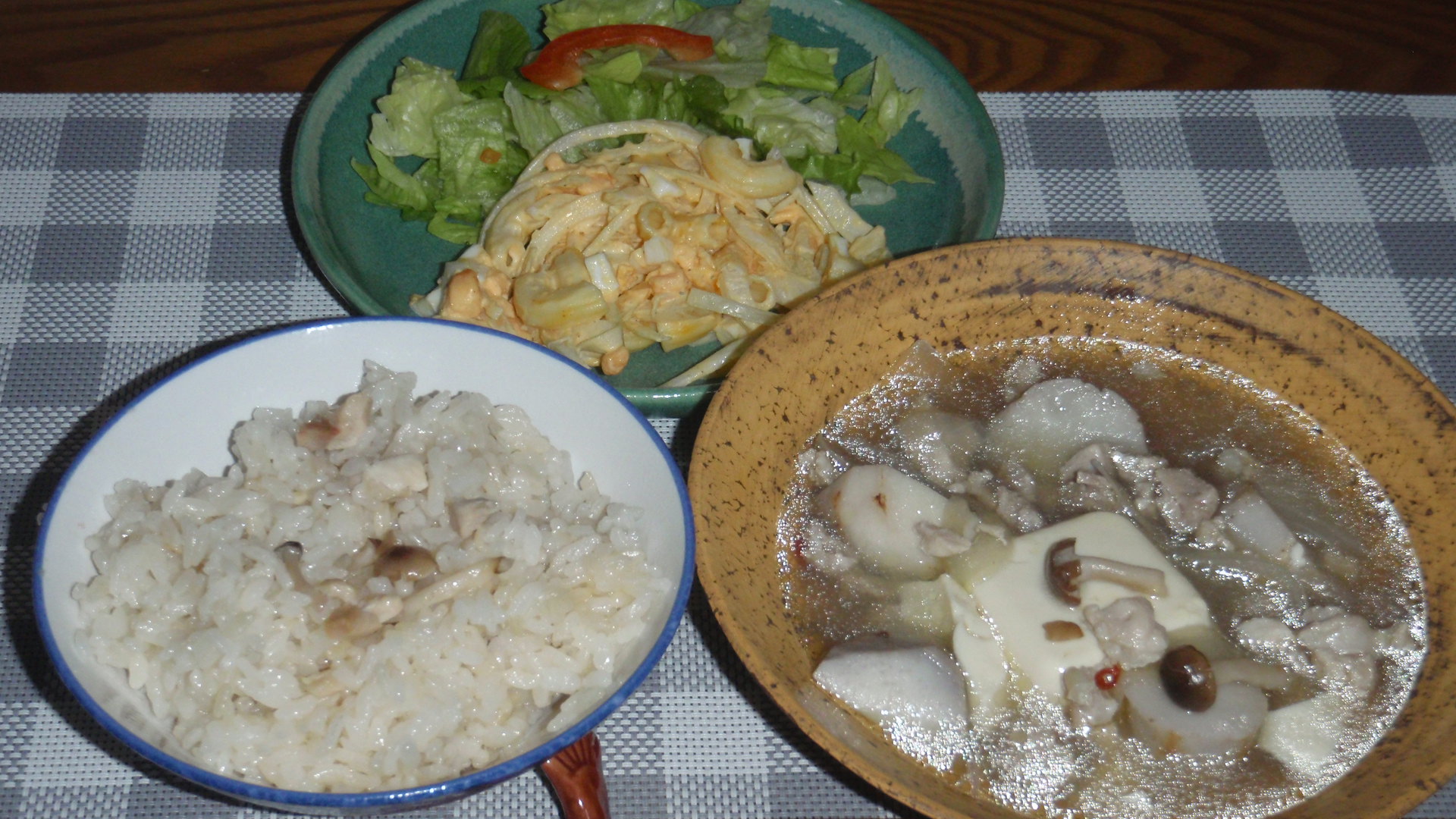 スーパーで夕飯の買い物をしていて、ぶなしめじが少し残っていたことを思い出した。そこからなにを作ろうかと考えた結果、鶏の細切れを買って来て、鶏肉とぶなしめじだけで炊き込みご飯を作る。一合のお米に料理白だし5ccとやさ塩パラパラなので、相変わらず俺が作るかしわご飯は色が薄い。鶏肉は当然余るので、里芋を買って来て一緒に煮ることにした。まずは鶏肉を水煮して、その間に里芋と在庫のタマネギを切って、灰汁を取って里芋とタマネギを投入した時点では、料理白だしで味を付けるのか、みそ汁にするのか決まっていなかった。前にも書いたが、かしわご飯と鶏汁や豚汁ならば、晩飯がご飯とみそ汁だけになってしまうんだよね。そこにサラダを付けたとしてもなんかショボい。いや、それこそが一汁一菜なのだが。そう考えて結局は料理白だしと鷹の爪で煮込み、少しだけ残ったぶなしめじと、4連で買ってまだ2つ残っている充填豆腐を1個投入する。昨日作った卵とマカロニのサラダに、こちらも昨日買ったカットレタスのサラダ。タイトルは「一汁一菜ではない」だけど、客観的に画像を見ると・・・今日は10.6Kmを走る日だったが、先週の5分36秒/Kmから一気に5分24秒/kmまで戻す。なんだ、やろうと思えばできるじゃん。減塩のせいでもなんでもなかった、ただ俺が緩んでいただけ。たぶん、数年前は5分15秒/Kmで走っていたと思うんだよね。そこまで戻せれば、そこから15~20秒遅いペースで21kmを走れるはず。そしてフルマラソンの前半21kmをそのペースで走れれば、きっと4時間の勝負に挑戦できるはず。