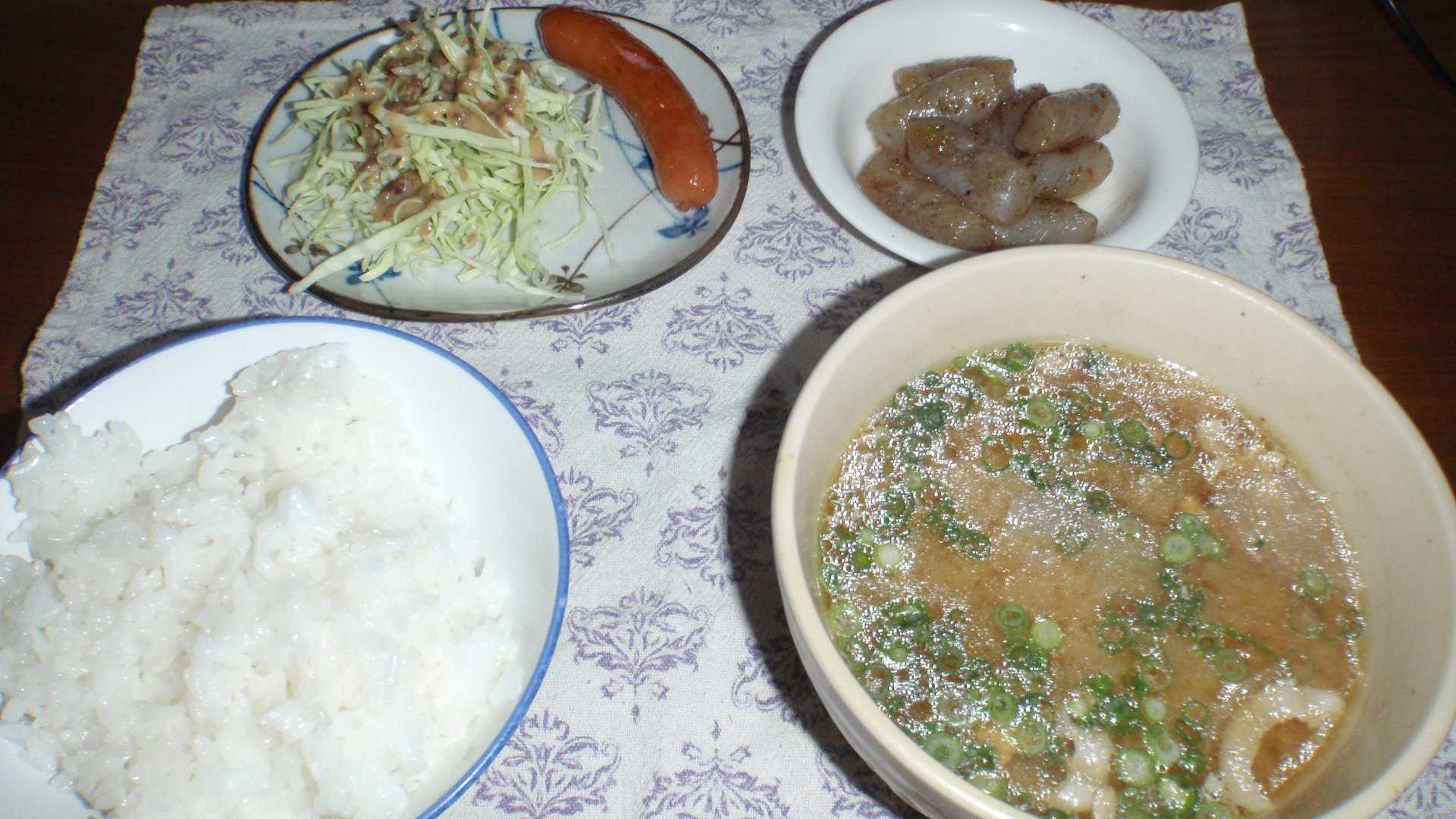 俺的には晩飯はこれで十分だが、動物性たんぱく質が豚汁の豚肉しかなく目立たないので、こんにゃくを炒める横でウィンナーを一本炒めて、キャベツの千切りを添える。