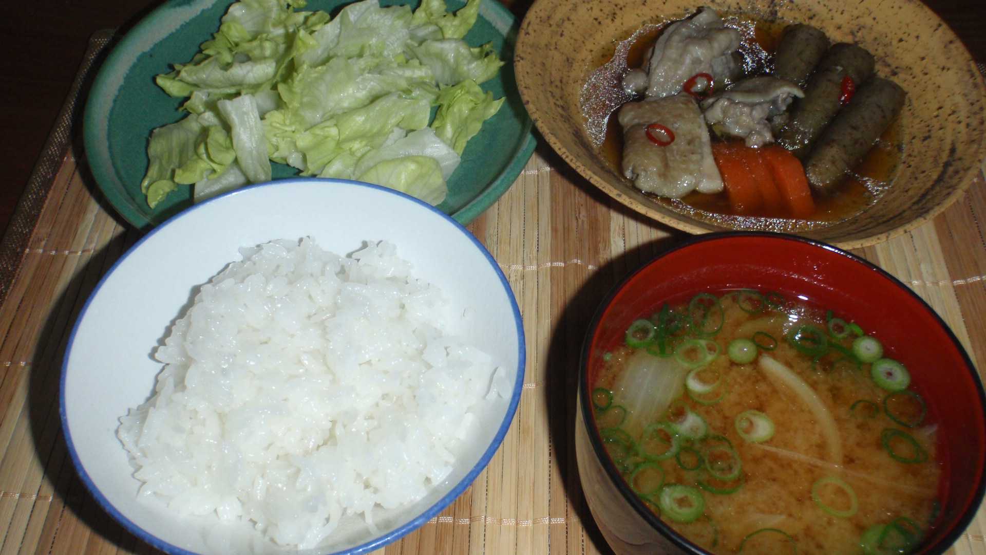 本来うどんを湯がくつもりだったが、結局今日は在庫のタマネギを具に味噌汁を作る。このタマネギは煮物に入れるには量が微妙だった。トマトの在庫がなくなったので、ちぎりレタスのみの生野菜。