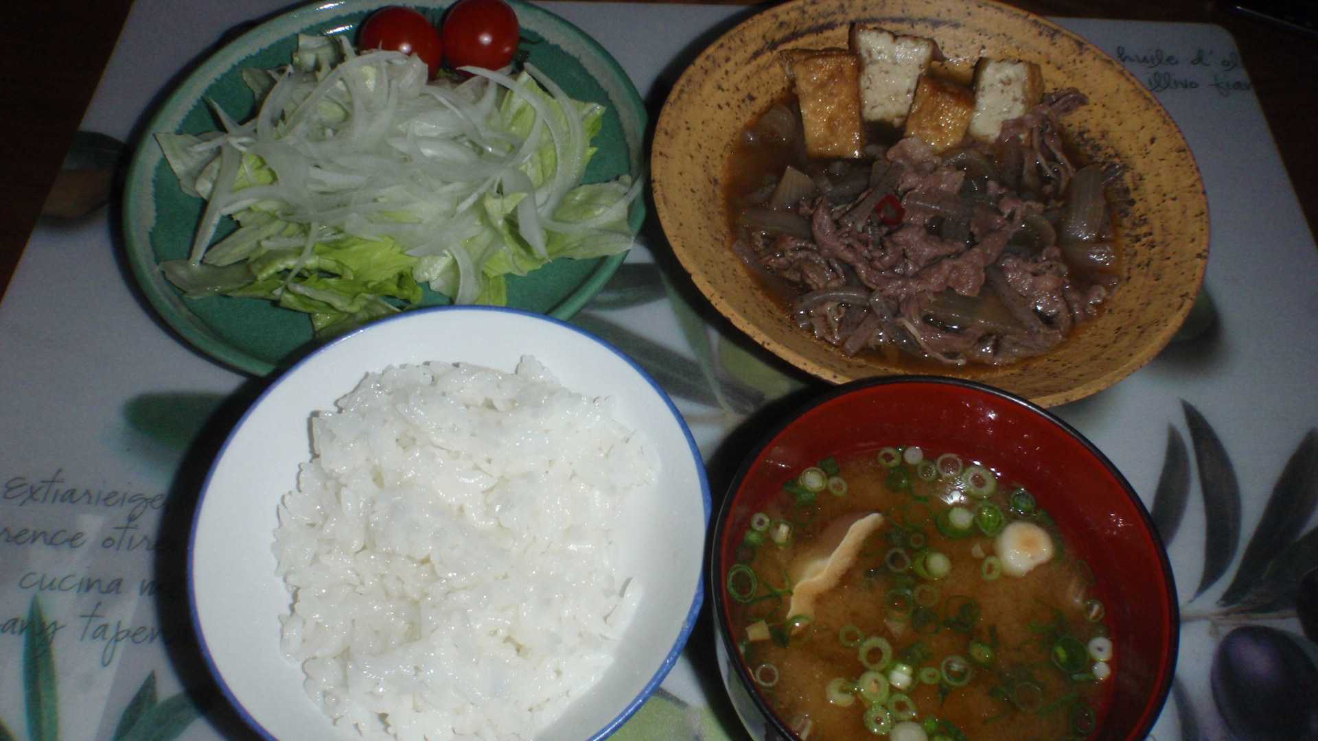 レタスともちろんオニスラの生野菜に、味噌汁もタマネギを具に使えばよかったのだが、それに気がついた時には包丁とまな板を洗ってしまっていたので、乾燥具を使う。