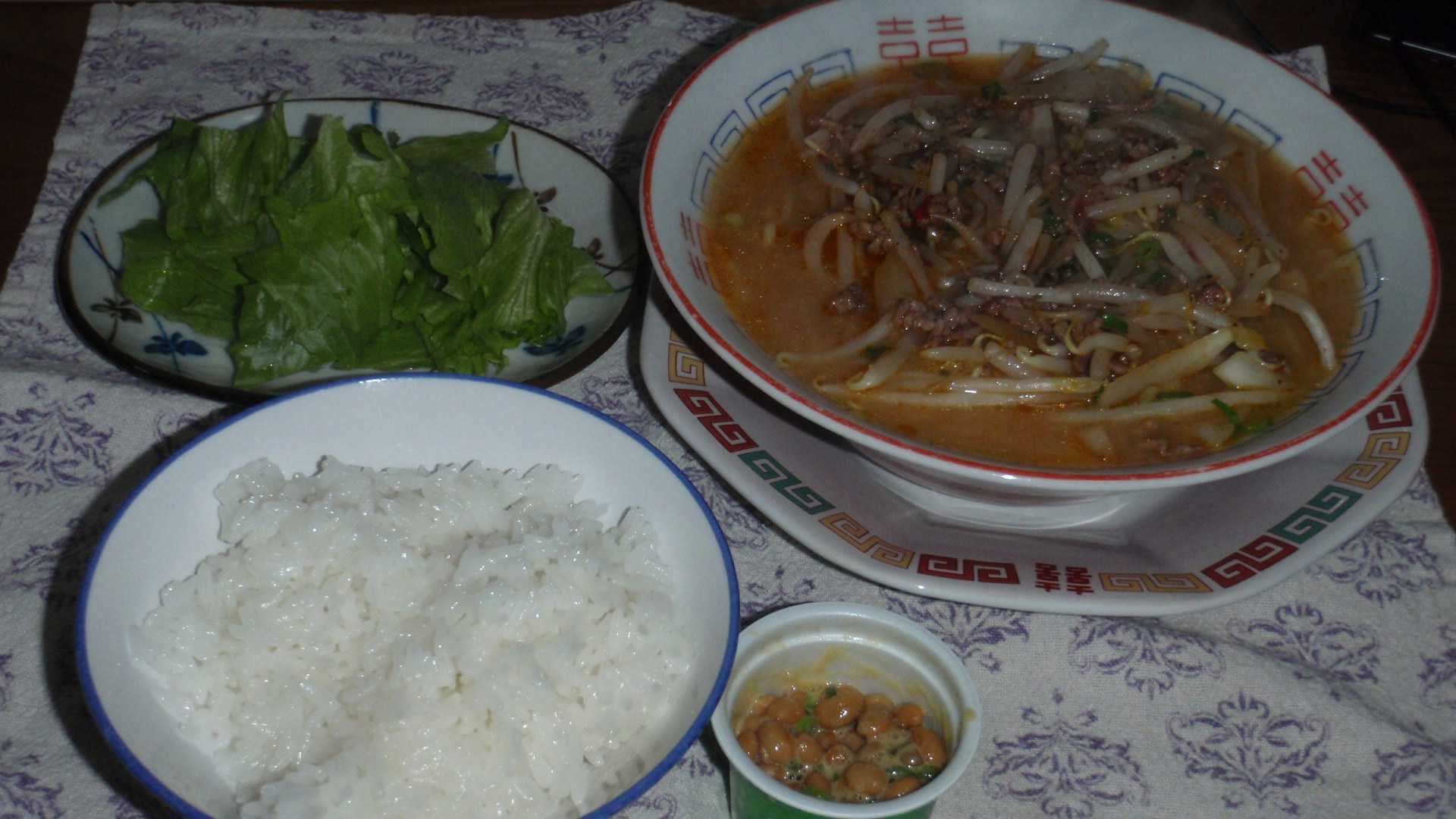 酒を飲んだらあえてご飯までは必要なかったが、酒を飲む前にもう炊き始めていたからご飯も付て、数日前に買った納豆をやっと使うときが来た。レタスだけは今日買って来たので千切った。