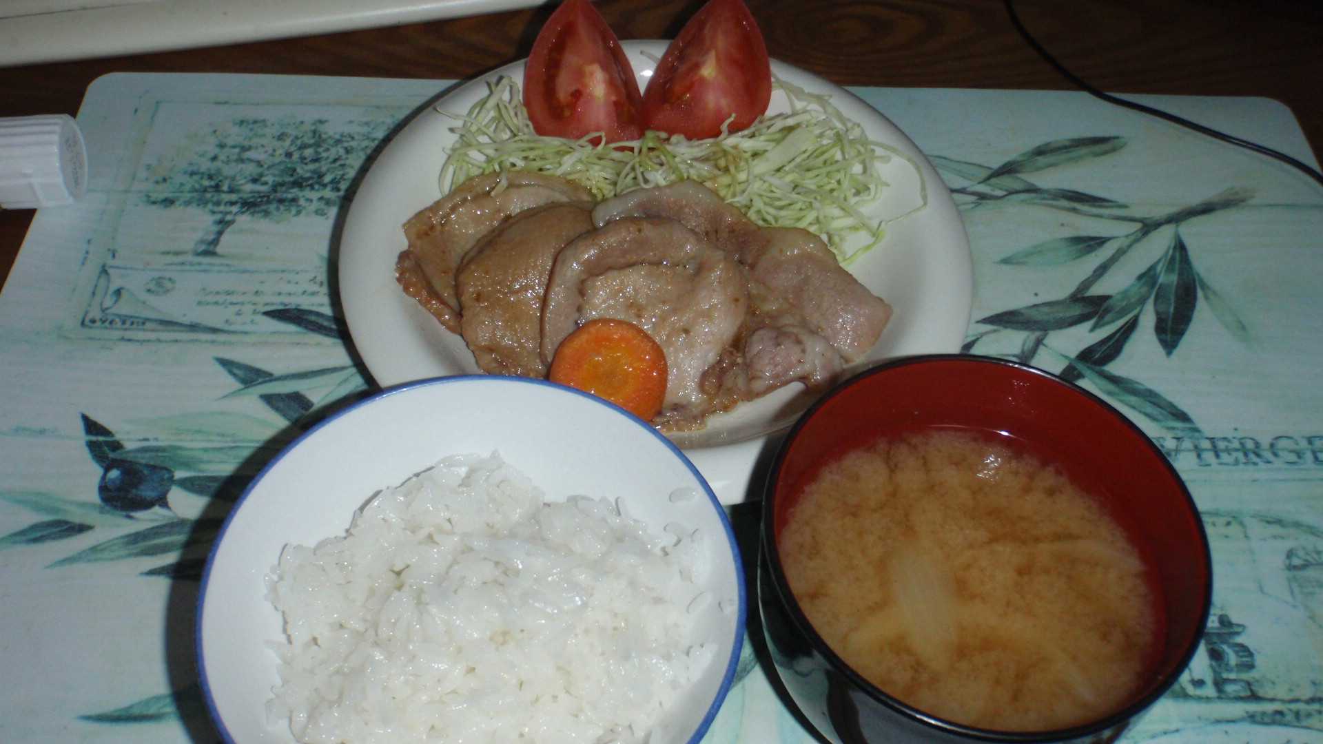 キャベツの千切りを敷いた上に、漬け込んだ豚肉3枚とついでに漬けたニンジンを焼いてを乗せて、