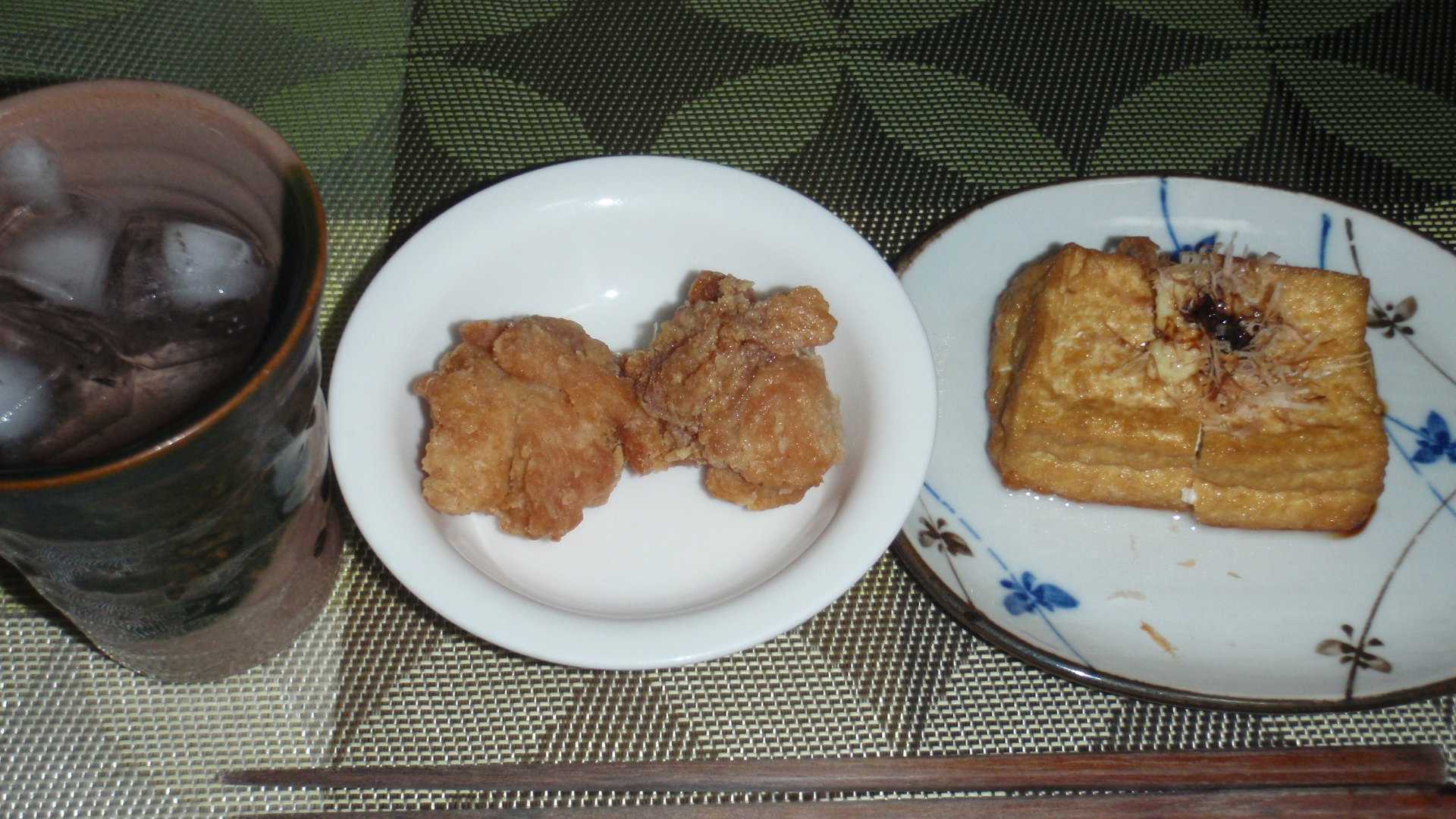 そういうわけで帰宅後、総菜の茶色い鶏のから揚げと、昨日の豚汁の残りの茶色い厚揚げをレンチンして酒のアテにする。厚揚げに乗せたチューブ生姜と削り節も茶色か。