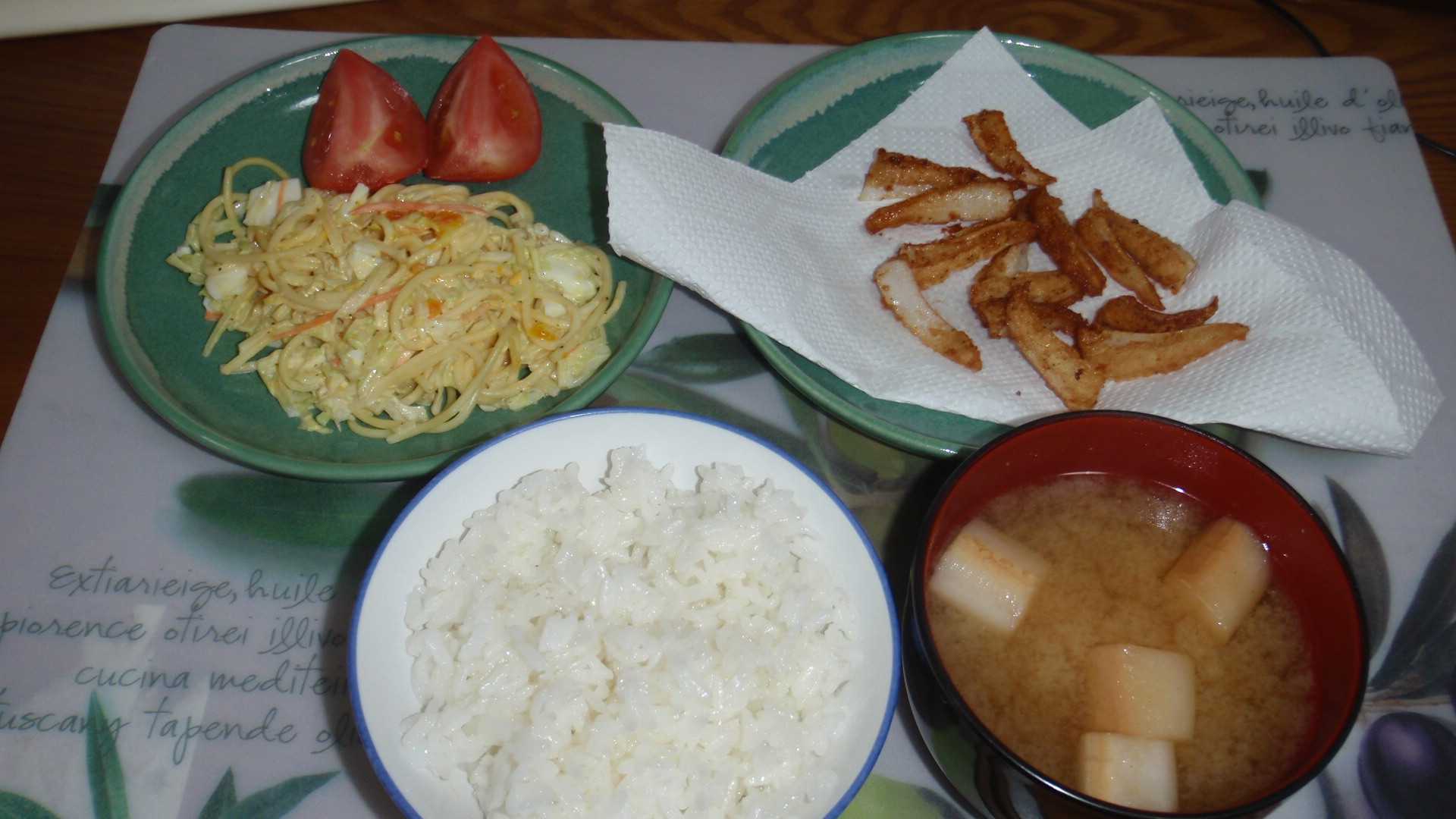 もちろんおかずもヤゲンのから揚げ。昨日作ったスパサラが今夜まであり、今日はトマトを買って来た。味噌汁の具は、麩の在庫があるうちはもうずっと麩。