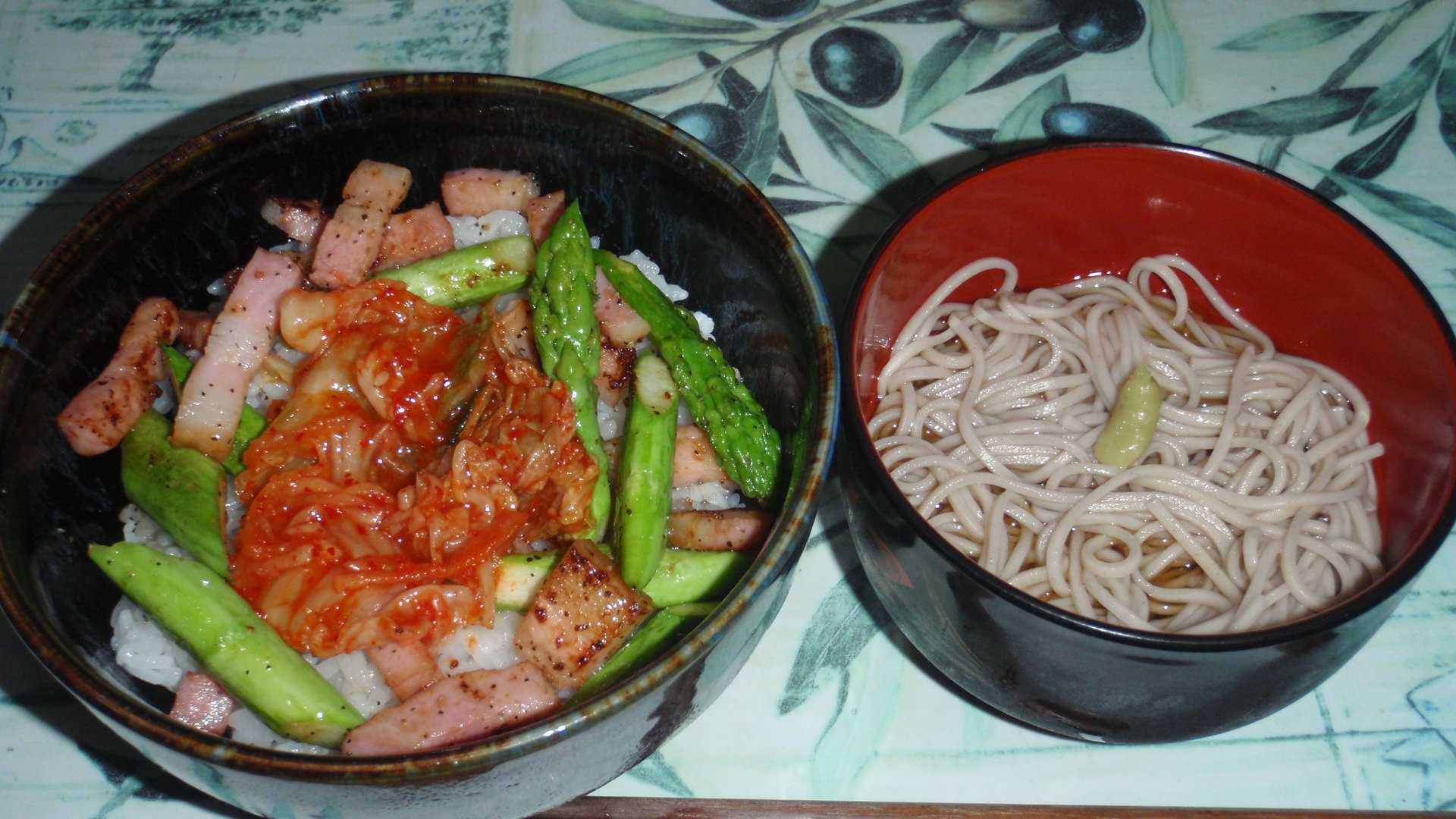 炒めたベーコンとアスパラを乗せる。ここに卵の黄身を乗せて卵ご飯というのも考えたが、キムチの在庫があるので、真ん中にキムチを飾る。