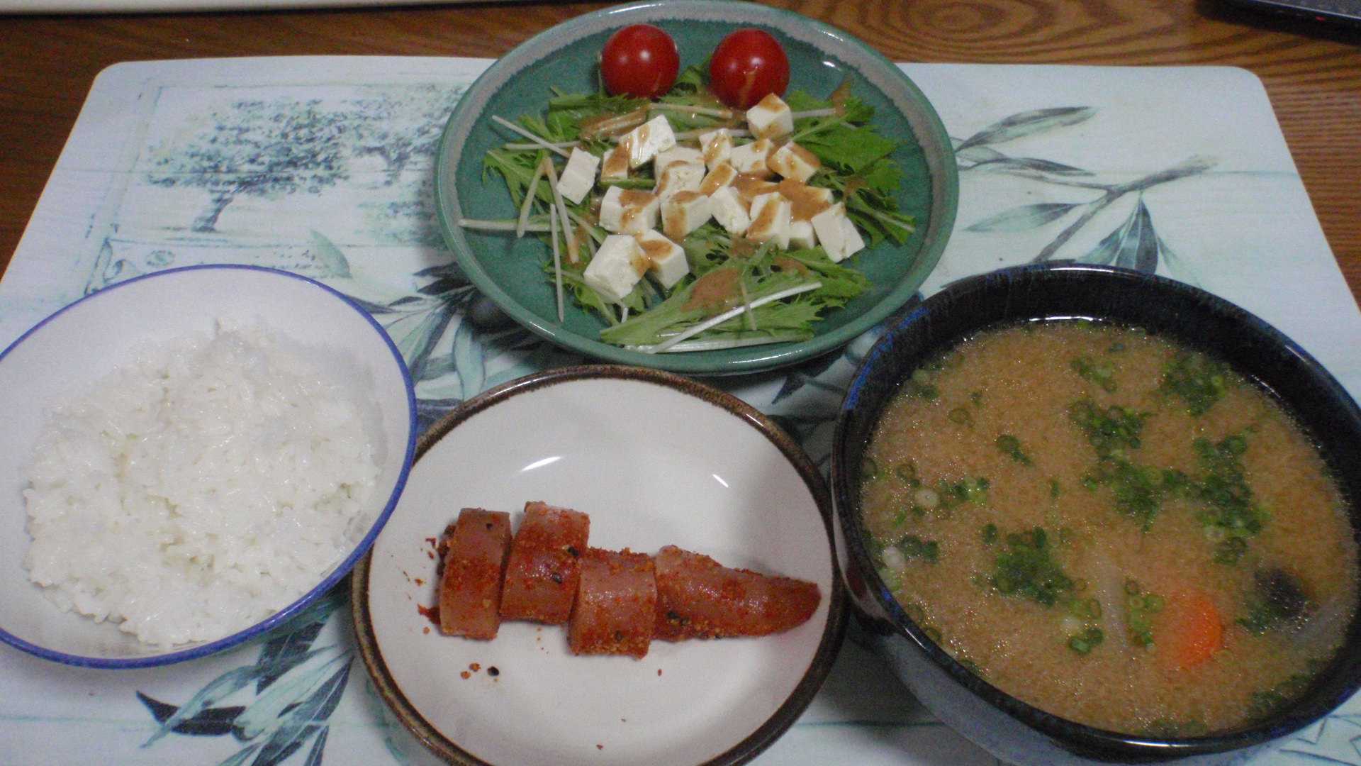 在庫の水菜を少し切って、これも在庫の豆腐の1/8丁を細かく切って乗せ、豆腐サラダにした。豆腐サラダに余った豆腐は鶏味噌汁に入れる。