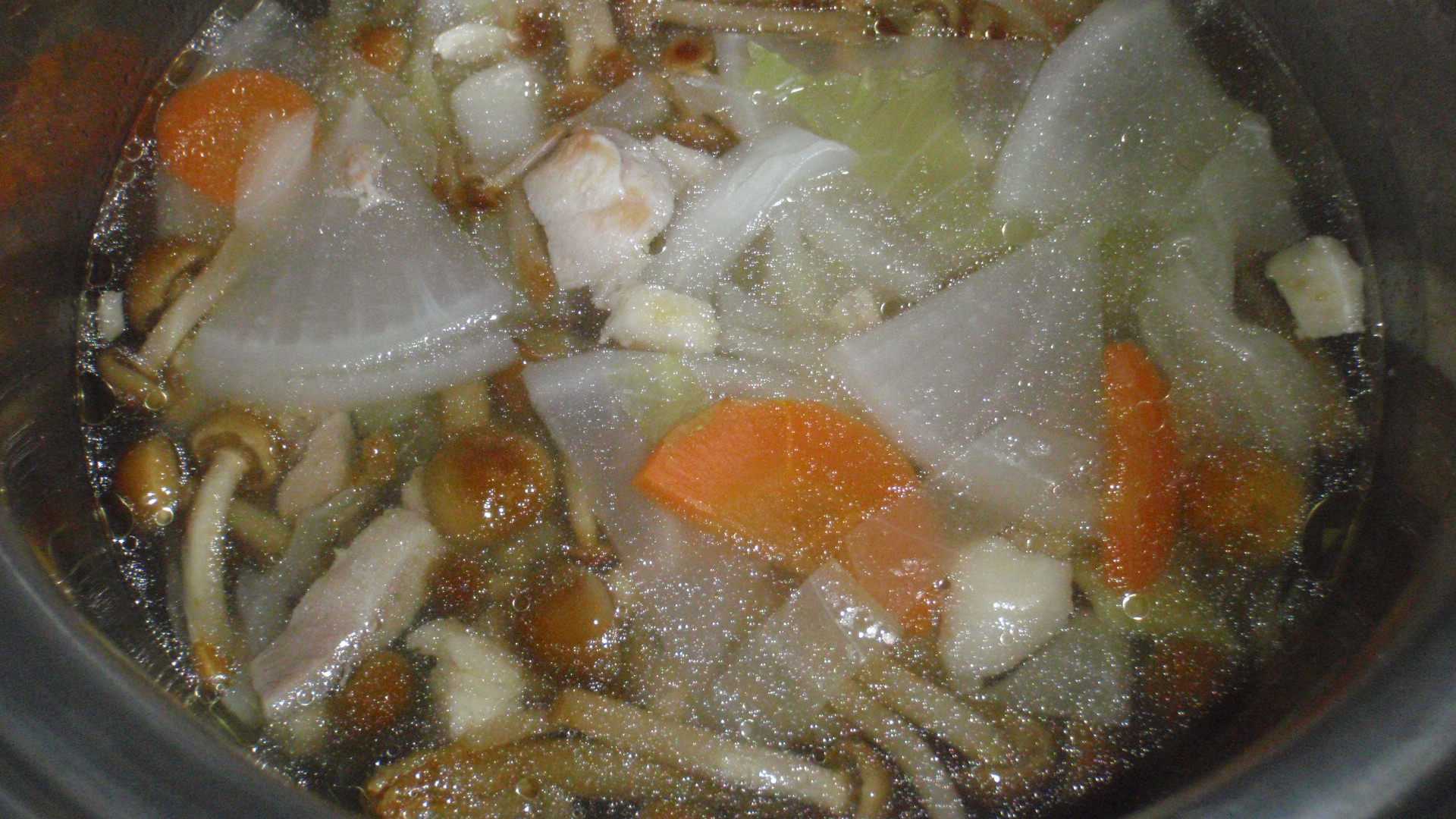 今夜も水煮スープを作ってもらうが、今夜はなめこメインだったのでさすがに味噌汁にしようかと思ったが、減塩味噌汁を使っても食塩相当量は1gくらいあるが、コンソメ1/4片ならば食塩相当量は0.6gで計算している。どうせ焼き鳥の分だけ塩分オーバーだが、だからこそ少しでも塩分が少ないように、今夜もコンソメと鷹の爪・コショウにごま油で味を調えて、今夜は半分だけを盛ったので、食塩相当量は0.3g。