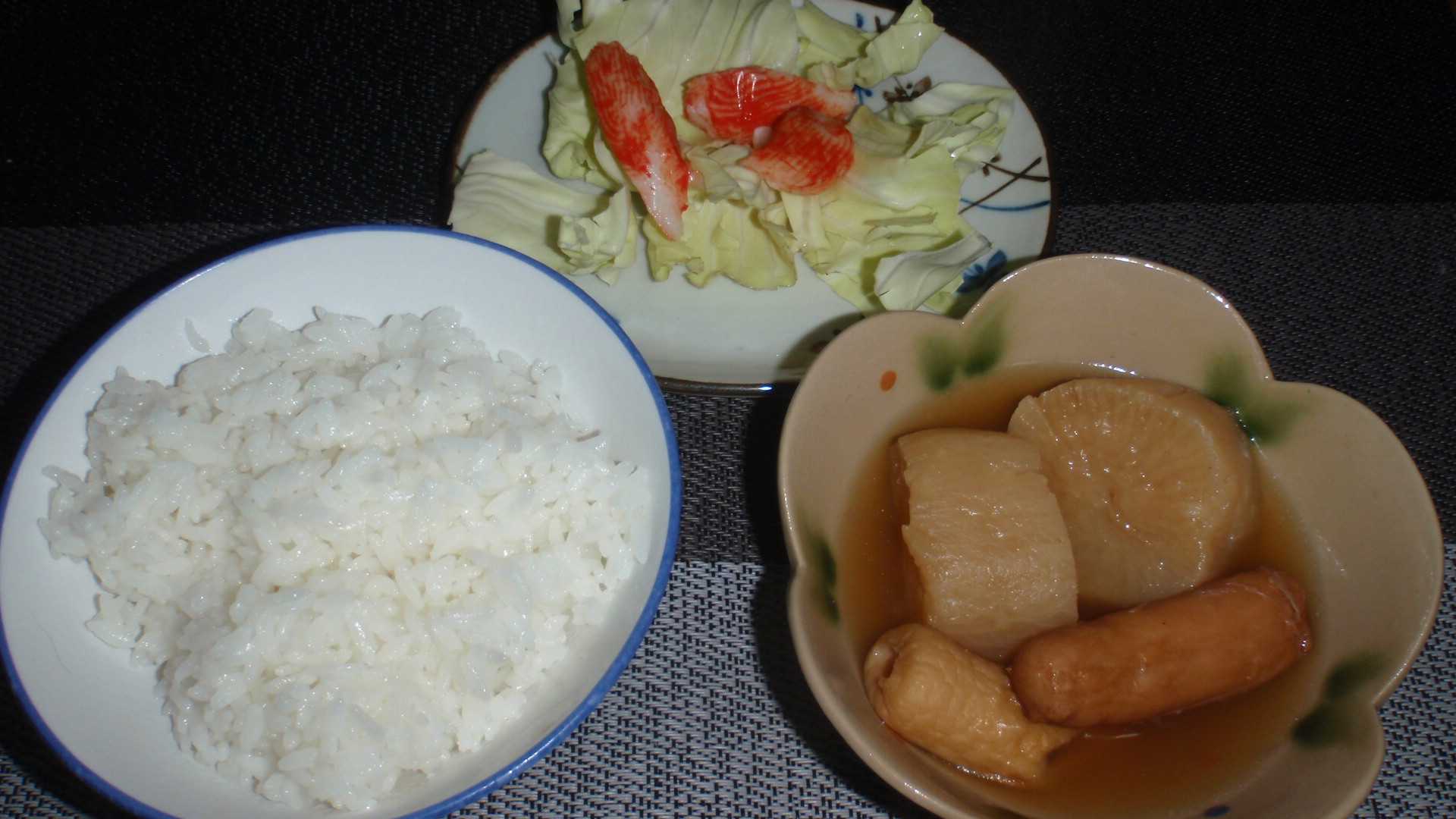 いただいたおでんの半分と(食わないならばもらわないとか偉そうなことを言っている割には半分)、キャベツの角切りに減塩かにかまがおかずになる。