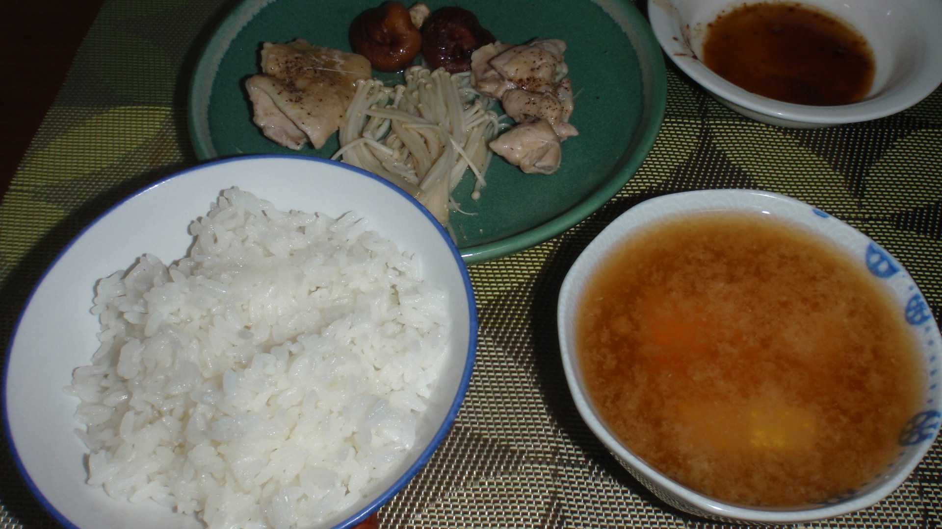 鶏肉2切れとしいたけをレンチンして、最後にエノキも加えてさらにレンチンし、粗挽きコショウと酒のアテで余った減塩しょう油で味をつける。味噌汁は酒のアテに余った豆腐を具に作る。