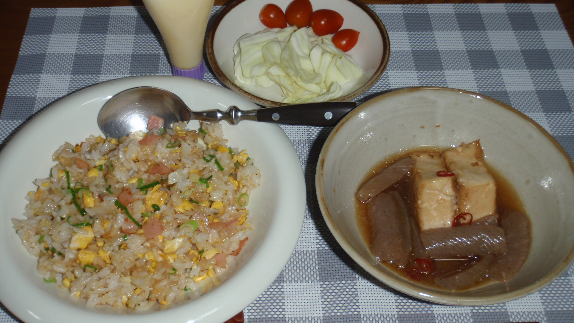 先に卵を炒って、在庫のハム・タマネギ・ニンジン・ニンニクを炒めて、レンチンしたご飯を加える。最終的にカットネギを加えて、粗挽きコショウとしょう油で味付けした。