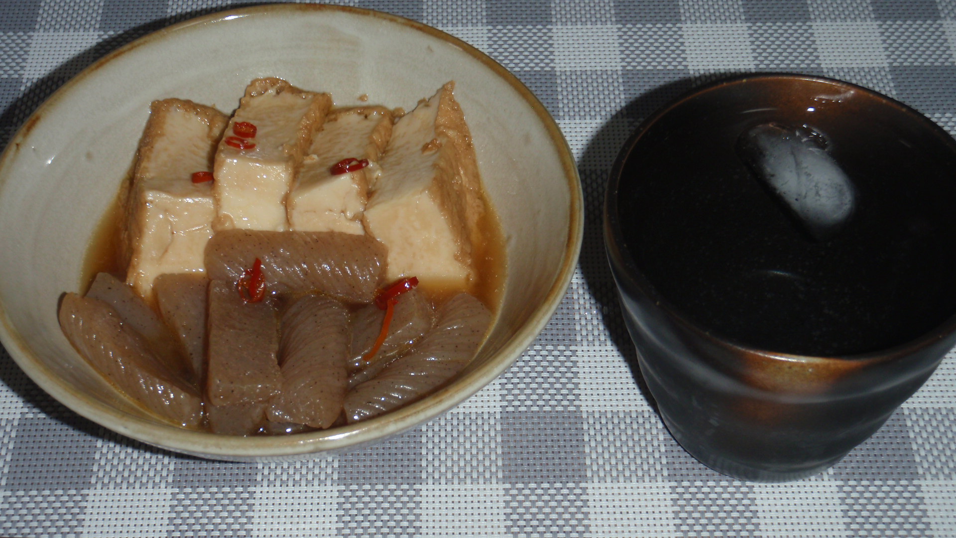 一昨日作った豚汁に余ったこんにゃくが少し余っていた。これもそろそろ使ってしまいたく、厚揚げを買って来て、料理白だし・しょう油・鷹の爪で煮込む。