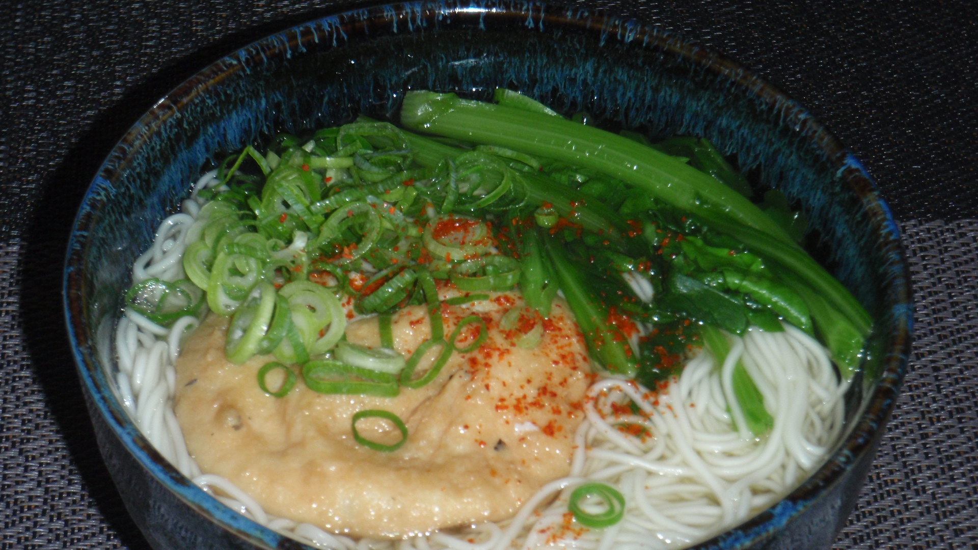 そんな今夜は昼飯を食い過ぎたこともあり、それほど腹が減っていないので、お米は炊かずにそうめんを80g湯がく。汁は料理白だしで起こすが、春菊をその汁に潜らせ、おでんから味が染むのが一番早そうながんもどきを借りて乗せる。