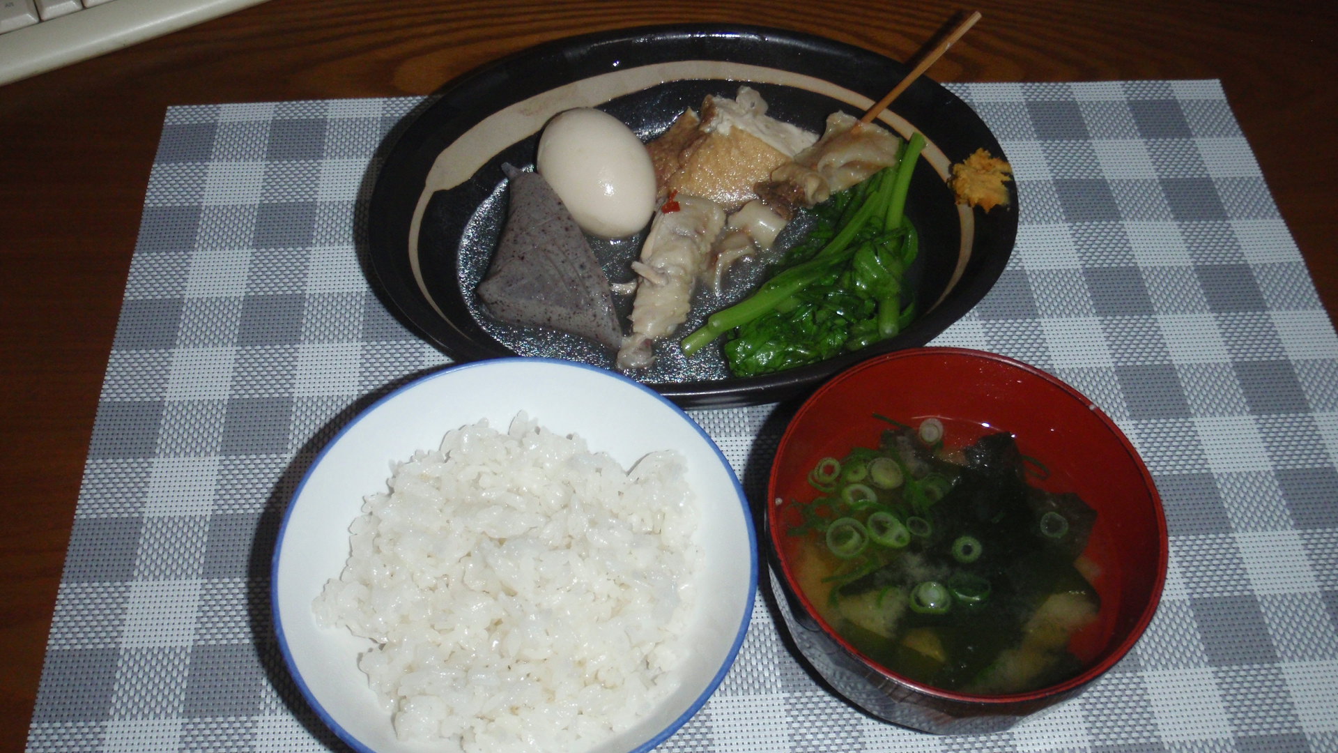 やっと牛スジと卵が登場する。緑の野菜として春菊もしゃぶっとして参戦。ここにみそ汁までは必要ない気がしたが、カットネギが余っているので戻しワカメを具にみそ汁を作る。