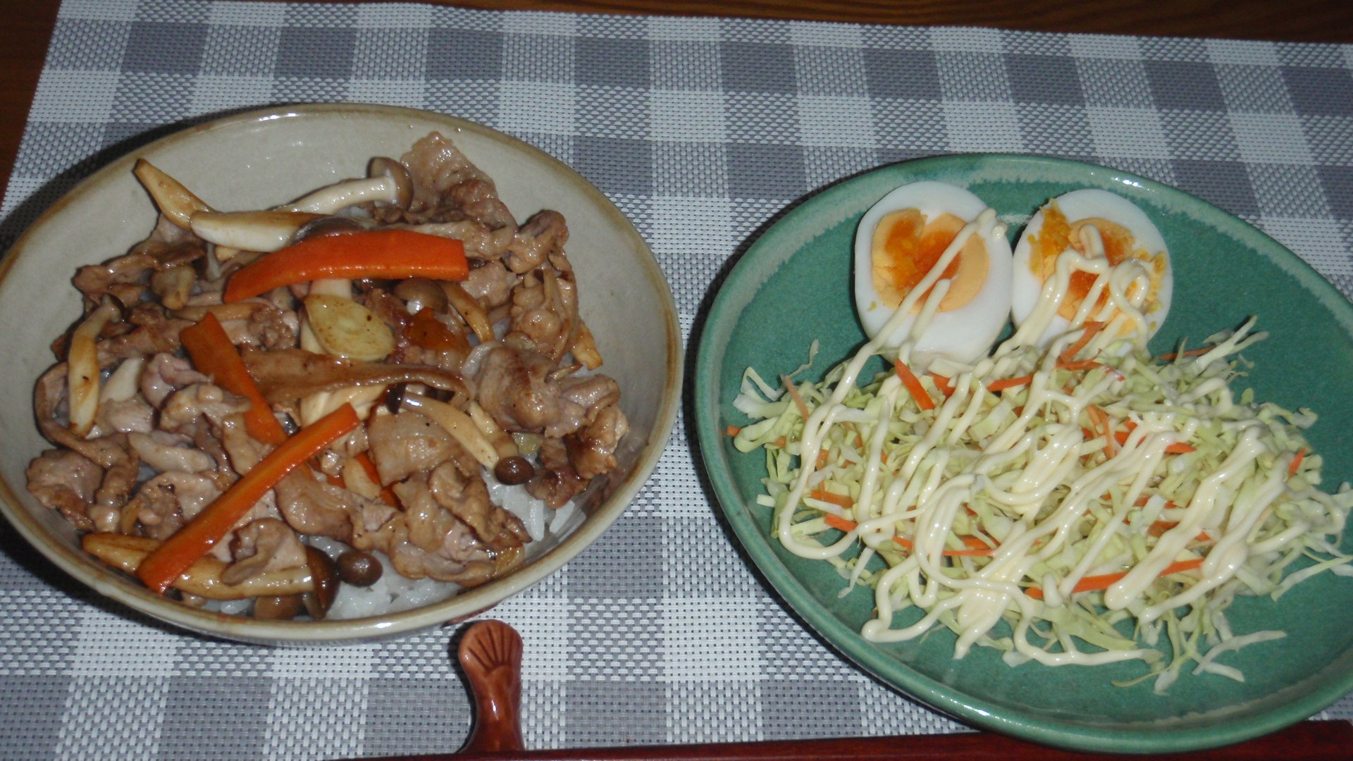 キャベツとニンジンの千切りサラダを作り、ゆで卵を作って和えようかと思ったが、面倒くさかったのでゆで卵として飾るだけ。