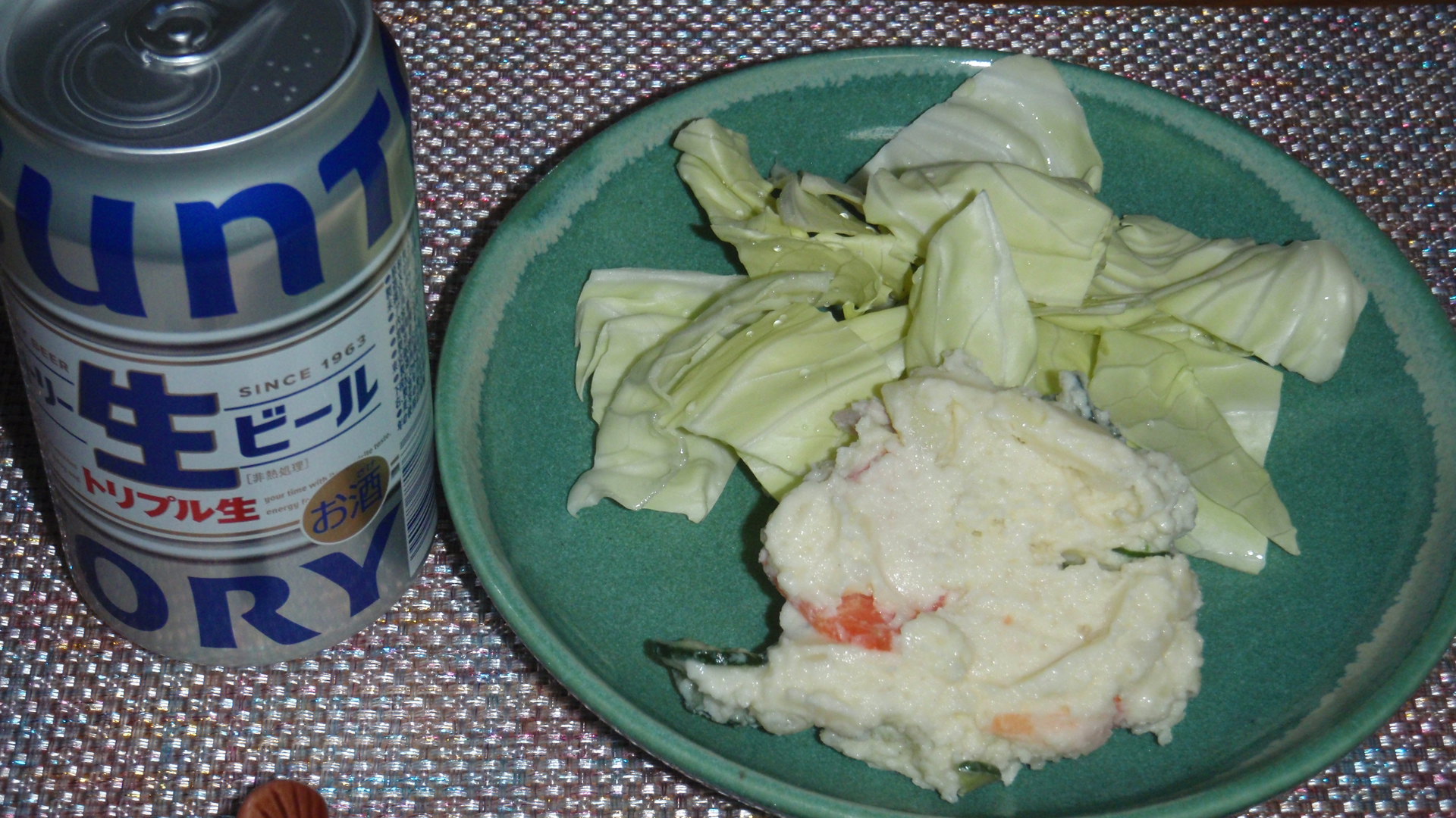 キャベツがもう少しあったので角切りにして、ポテサラと角切りキャベツが今夜の酒のアテ。今夜は野菜がここにしかないもので、いちおう野菜も食いました的なアピール。