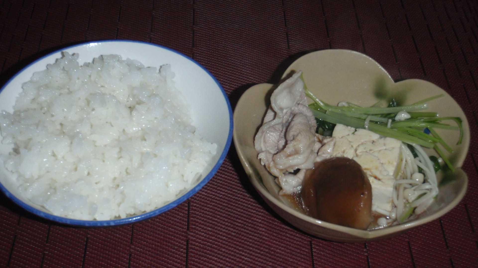 さて、昨日買った水菜と豚肉の切り落としが少し余っている。昨日は炒めたのでと考えたら、今日はなべ物だなと、豆腐としいたけ・えのきだけを買ってきた。