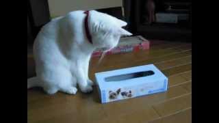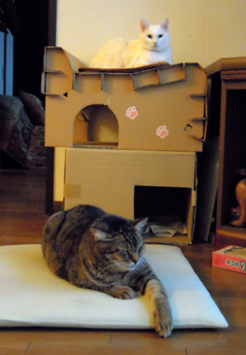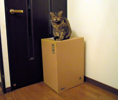 ピンポ~ン と 大きな箱が届きました。週末に さんで注文。トイレ砂がセールで安かったのに、クーポン利用でさらに10%OFFというわけで 多めに買いました。「新しいお立ち台? なかなか いい眺めだよ!」おり君は さっそくチェックに来ました。 チャイムの音ともに 押入れに避難していたひなも遅れてチェック「これ なあに?」 「来たか・・・」 おり君が 箱の上にいるのを見て・・・「ひなちゃんも 乗りた~い!」 「ふたりは無理だよ」 今回は譲らなかったおり君です。