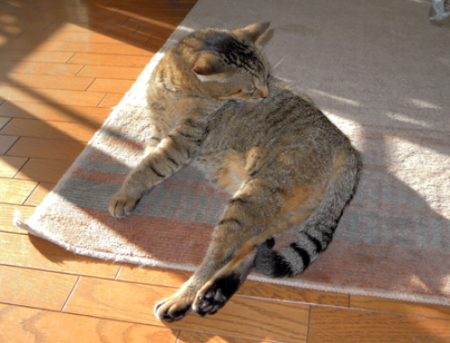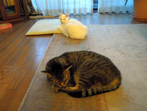 昨夜遅くのおり君「あ~あ...また あんな格好で・・・」キャットタワーのてっぺんから見下ろす視線の先ではひなが こんな格好でいます。「この格好が 落ち着くのよ」 おっぴろげ~姿に 季節は関係ないようです。この格好のまま おり君の視線を受け止めていました。 いつもなら 「よくある光景」として、ここで終わるのですが・・・。 今朝昨夜 ひなが寝転がっていたあたりで 今度はおり君が倒れてました。ひなの格好が 気持ち良さそうに見えたのでしょうかさすがに仰向けおっぴろげ~は 男の沽券に関わる とできなかったのかもしれません。