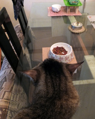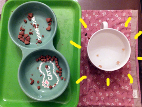 少し多めにカリカリを出していくこともあり、帰宅したときには、完食されていないことも多いです。それはいいんだけど、すごい食べ散らかしよう・・・飲み水の中にまで入っていました。 食べ散らかしがひどいこともあり、テーブルに餌皿があります。その方が 掃除もしやすいので。「なんの写真を撮ってるの?」ひながやってきました。達に 食事マナーを言ってもしょうがないですよね。