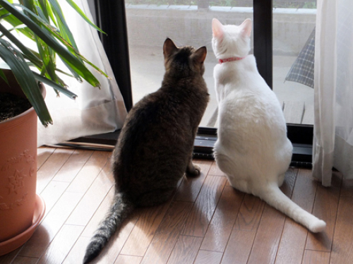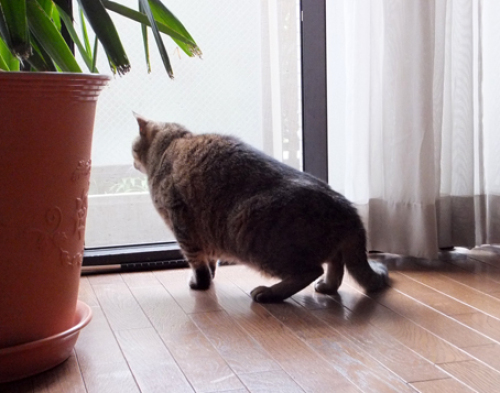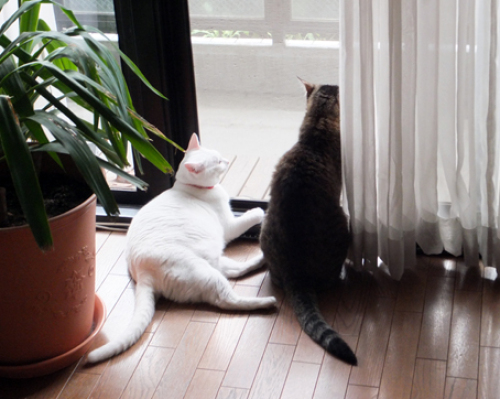 今日は朝から暑かったです。まだネコ達も大丈夫そうなので、ウチではエアコンつけていないけど、職場では さすがに今日はエアコンをつけました。 週末の掃除の時、ひなが隠していたボールを発見「早くこっちに蹴ってよ」ひなが、遊び終わった後に仕舞いこみ、忘れていたみたいです。忘れていたはずなのに、見つかると遊びたがります。そんなひなを 窓際から おりが眺めています。