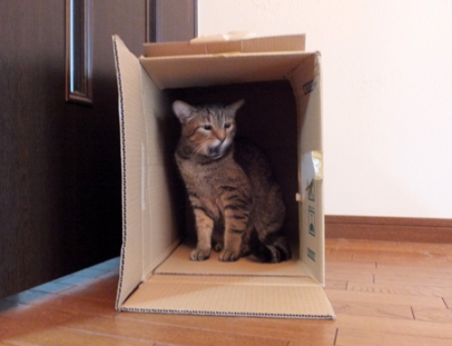 先週届いた猫砂などの入った箱の中身を ようやく収納。空き箱を置いておくと、いつものように まずはおり君が「コレ、でかすぎー!」・・・ですよね。そうじゃないかとは思いました。それに 今回の箱は少し薄めで、上に乗ると箱が壊れそうなんです。飛び乗ったものの 不安定なせいか すぐに飛び降りていました。 おり君が出てくるのをじーっと待っていたひなもIN!箱の奥でゴソゴソやっているひなを 激写していたら・・・ クルッ 「なに?」・・・やっぱり振り向きました。