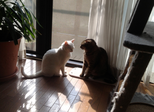 最近あまり写真を撮っていないので、夫がスマホで撮った写真を拝借です。朝が弱い私がまだ寝ぼけている時間のたち向かい合って 何を話しているんでしょなんとなく神妙な表情で・・・ 猫の朝礼? この後、珍しくふたり揃って朝ごはんを食べていました。 「なに撮ってんのよ?」おり君は 日によって食欲にムラあるので、2種類のカリカリを出してあげています。年齢とともに ごはんにも気を遣います。