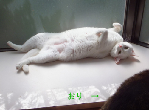 今日は 朝から雨でしたずっと食欲のなかったおり君、昨夜から急に食べ始めました。ちょっと痩せ体型になってしまったので、少し体重を戻さないと! そんなおり君が、朝 何を見つけたのか 窓辺へ座るでもなく この体勢のまま じーっと何かを眺めてました。なんか疲れそうな体勢です。ベランダの外に止まった車のハザードランプの点滅を見ていたようです。・・・ それ、おもしろい 夜は ふたりのひなに挟まれていました手前のひなは、私の膝の上に乗っているため、おり君が じーっと見ています。「そこは、僕の場所なのに・・・」というところでしょうか。