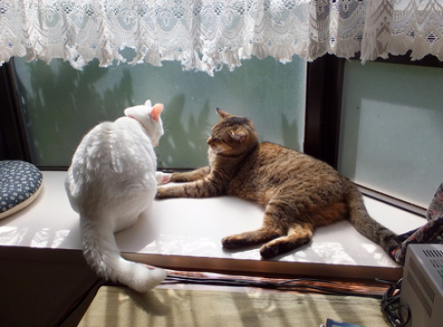 確か梅雨入りしたんですよねぇ梅雨空はどこへいってしまったんでしょう雨は好きじゃないけど、適度に降らないと困りますよね。。。 おかげで おり君は ひなたぼっこ三昧です。いつものように 出窓でひなたぼっこを始めたら・・・「ねぇねぇ、こんなところにいないで、遊びましょ!」 「・・・」 「ねぇーったらぁ~」 「やだよ。触らないでくれ」 「あっちに行ってくれよ!」 「あ! ひなちゃんに触ったー」 なかなか腰をあげてくれないおり君にしびれを切らしたひな次の瞬間「こうなったら レスリングごっこよ!」 で、当然 返り討ち「きゃ~!!」 「言うこと聞けー!」 おり君は11才になったとはいえ、まだまだ力では負けません。 明日に続く・・・