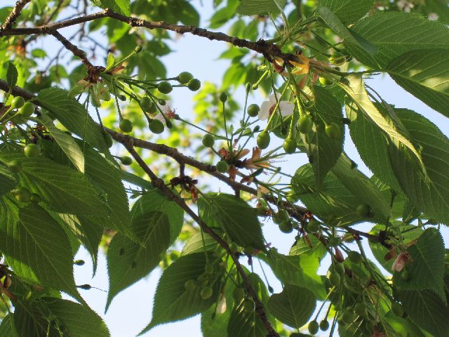 今年 最初の桜んぼをみつけたのは 4月の半ば頃だった ・・・ 今日、違う場所で見つけたさくらんぼは 少しづつ色づき始めていた 半分づつ 花も可愛く 実も可愛い♪