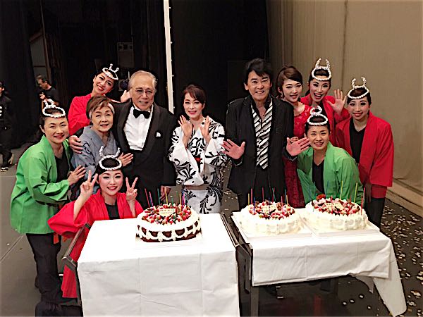 皆さんこんばんは、一週間のご無沙汰ですがお元気ですか? 関東地区はなかなか梅雨が明けません…そんななかですが、早いもので、明治座・島津亜矢特別公演も後5日となりました… 先日、今公演の最年長の穂積隆信さんが85歳の誕生日を迎えました…私も奈良富士子さんも7月生まれと言うことで、一緒にお祝いしてもらいました…^_−☆ 85歳の穂積さんを筆頭に田口計さん…とん平師匠…とベテランの役者さんが大奮闘です^_−☆ そんなワケで、若手の私も頑張りますヨ〜^_−☆