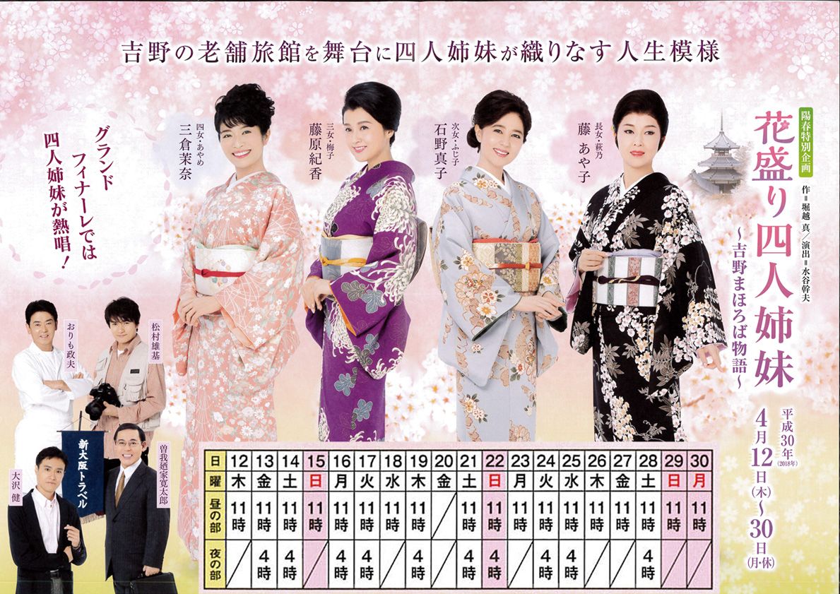 ●「花盛り四人姉妹」公演出演日 時:4月12日(木)~4月30日(月)場 所:新歌舞伎座(大阪)チケット:1階席 12,000円/2階席 6,000円/3階席 3,000円/ 特別席 14,000 円【チケットお問い合わせ先】 YG Club Tel 03-6435-2195(平日の11:00~18:00) お気軽にお問い合わせください