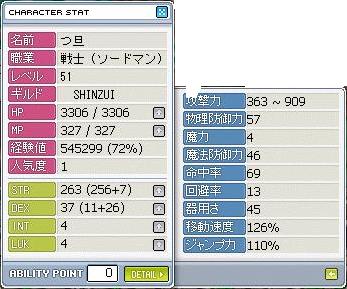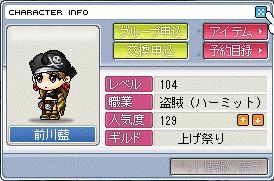 どうも~露店出してたら知らない人に人気下げられたお茶です。( ノ゚Д゚)こんにちわその後人気を下げてあげようと思ったのですが。知らない人の人気を下げるより、知ってる人の人気を上げる方が。゚+.(・∀・)゚+.゚イイ!!と言う事になりまして、(ry昨夜ギルド「真髄」のフクマスの芋sがパスクラされたと言う事で、100kと要らない装備を寄付しましたよ~w100k+αしか寄付できないσ(・ω・`)って・・・orz。・゚・(ノД`)・゚・。3次職寸前にパスクラなんて・・・クロスボウマンだよ?コレからが楽しい時なのに。゚(゚´Д`゚)゚。アイスショット見たかったのに~('A`)ネクソン何やってんだよ(#゚Д゚)プンスコいや~実はσ(・ω・`)もパスクラされそうになったんですけど・・・相手が厨房だったので普通に大丈夫でした(ノД`*)なんか内緒が関係してるらしいですねぇ~さてと昨日は50~51Lvにしましたよ~(ノ゚Д゚)八(゚Д゚ )ノイエーイ50~60Lvまでがシンドイ('A`)武器が・・・武器が~。・゚・(ノД`)・゚・。現在のステはこんな感じですよ~↓注;これは命中装備の時のステです(´・ω攻撃装備だとワイルドカーゴに攻撃当たらないんですよ(´;ω話戻りますけど人気下げられた時の画像('A`)ヴァー↓(#゚Д゚)でも、暴言吐いたり人気下げすると逆に晒される可能性があるため、まぁ何もしないでおきました~優しいコンバット君が人気上げてくれたしね(*^ω^)