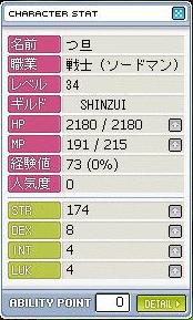 えーと書く事無いのでつ旦のステ晒しをします(´・ω・)カワイソスこんな感じです。(´・ω昨日一応頑張ってゾンビ狩りしたんですけど・・・1Lvと70%しか上がりませんでした。・゚・(ノ∀`)・゚・。サク時間外に48%~80%まで上げてサク時間をフルに使ってこれですよ(゜∀。)ワヒャヒャヒャヒャヒャヒャ斧狩るの遅すぎですorz金も全然稼げません・・・70Lvぐらいから赤字です・・・終ってますねorzマゾマーゾマゾ彦ですよ(ノД`*)(意味不