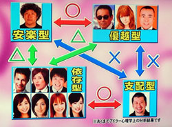 しっかり者は損をする?(記事)これ、男性とか女性に関係なく甘え上手な人は仲よくというのを大切にしている人のかもしれません。先週のエチカの鏡で人の性格、相性スペシャルでアドラー心理学を特集していて比較的簡単に分かるテストを紹介していました。よかったら、それぞれ当てはまる番号を選んで下さいね。友人とドライブ中に道に迷ってしまいました。あなたは、どうしますか。1)気にせず運転を続ける2)誰かに道を聞く3)地図を開き調べる4)近くで別の遊びを見つける友人から「旅行どこに行く?」と聞かれたときあなたは、どう答えますか?1)どこでもいいよ2)あなたの行きたい所に行こうよ。3)とにかくついてくればいいから。4)前から○○に行きたから、そこに行こう。「トイレに行ってくる」と言ったら「私も行く」と言われました。しかし、トイレは1つしか空いていません。あなたは、どうしますか。1)友人に譲る2)お願いして自分が先に入る3)先に言いだしたのは自分なので当然先に入る4)別のトイレがないかと探す街で他人と肩がぶつかりました。あなたは、どう思いますか。1)「イタッ!でもしょうがないな」2)「すみません。」3)「気をつけろよ。」4)「特に気にならない。」あなたの好きなお菓子を友人が食べようとしています。あなたは、どうしますか。1)仕方ないと諦める2)半分分けてもらう3)全部自分が食べる4)気にもしないで、別のお菓子を食べる。5つの質問の答えであなたは、どれが一番多かったですか。自分もそうだったのですが決めきれないというときもあると思います。そういうときは、複数の所を見てみて下さい。実は、その結果で性格と相性がある程度分かるのだそうです。さっそく、1番から順にスタートです。1番は、安楽型。安楽型というのは省エネ型の人生を生きるあまりエネルギーを使わないで現状を満足しがちな面があり他にも、他人から干渉されるのを嫌い他人よりも自分に興味があるそうです。自分の考えを押し付けたりするのを避けているということですよね。2番は、依存型。依存型というのは、何かをするときできるだけ人に頼って生きていこうとしてどれくらい甘やかしてくれるかな受け入れていくれるかなというところに一番興味、関心があるタイプだそうでお友達に面倒見のいい子が多くて周りの人に、ある程度頼っていいだろうと思っていて他にも、自分で決断するのを嫌い他人の行動を気にしている傾向があるそうです。仲間を大切にしているということですよね。3番は、支配型。支配型は、リーダーシップをとりたがる人で自分の思い通りに形を作りたいと思うタイプだそうで責任感が強い人が多く決断力が大事だと思っていて他にもべたべたした人間関係を嫌い愛情よりも仕事を優先する傾向があるそうです。4番は、優越型。自分の中にある価値観とか大切なものを実現するために頑張るタイプだそうで他にも、他人よりも自分への興味が強いため自分の世界を持ち、自己陶酔しやすい傾向があるそうです。 それぞれのタイプでの相性はどうなっているかというと安楽型と優越型は両者とも自分に関心があるタイプで兄弟みたいなものですからお互いに尊重し合える良い関係にある。また、依存型と支配型の組み合わせでは依存型は、頼ることで安心感を得られることができ支配型も頼られることで力を発揮できるそうです。逆に、悪い組み合わせは、支配型と優越型で他人をコントロールしたい人と自分の世界を大事にする人は噛み合いにくいですよね。 また、同じ型同士でも相性がいいとも限らないそうで優越型と優越型は他人と関係なく自分の好きなことをやりたい人なのでお互いのやりたいことを認め合えるので良い関係を築きやすいそうです。監修していた島田先生は「こういうのは、使い方次第なので 上手に使えば、マイナスに見えていても プラスになりますから どういう風に自分の性格を見ていくか パターンにあまりこだわらないで 人間関係を豊かにするかということですよね。」って、お話されていました。人間関係だけでなく自分のなかにもいろんな性格を持った自分がいるしその自分の性格について客観的に観る目を持っているというだけでゆとりがあるし、エネルギーが高いですよね。自分を大いに楽しませて自分の声に耳を傾けそして、みんなとも仲よくいるそういう状態でいたいなって思いました。『愛される努力』(2010/04/09)『赤いハートの実がなる』(2010/05/26)pretty world-Lisa Ono