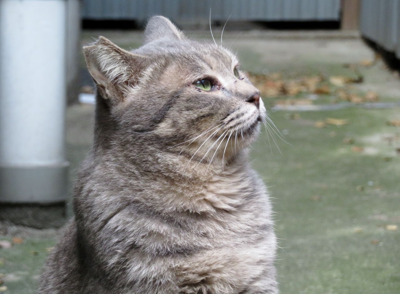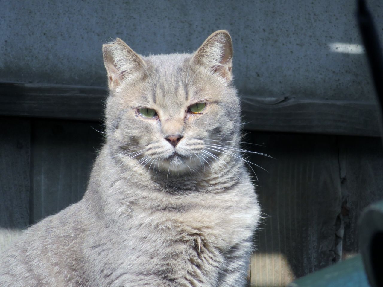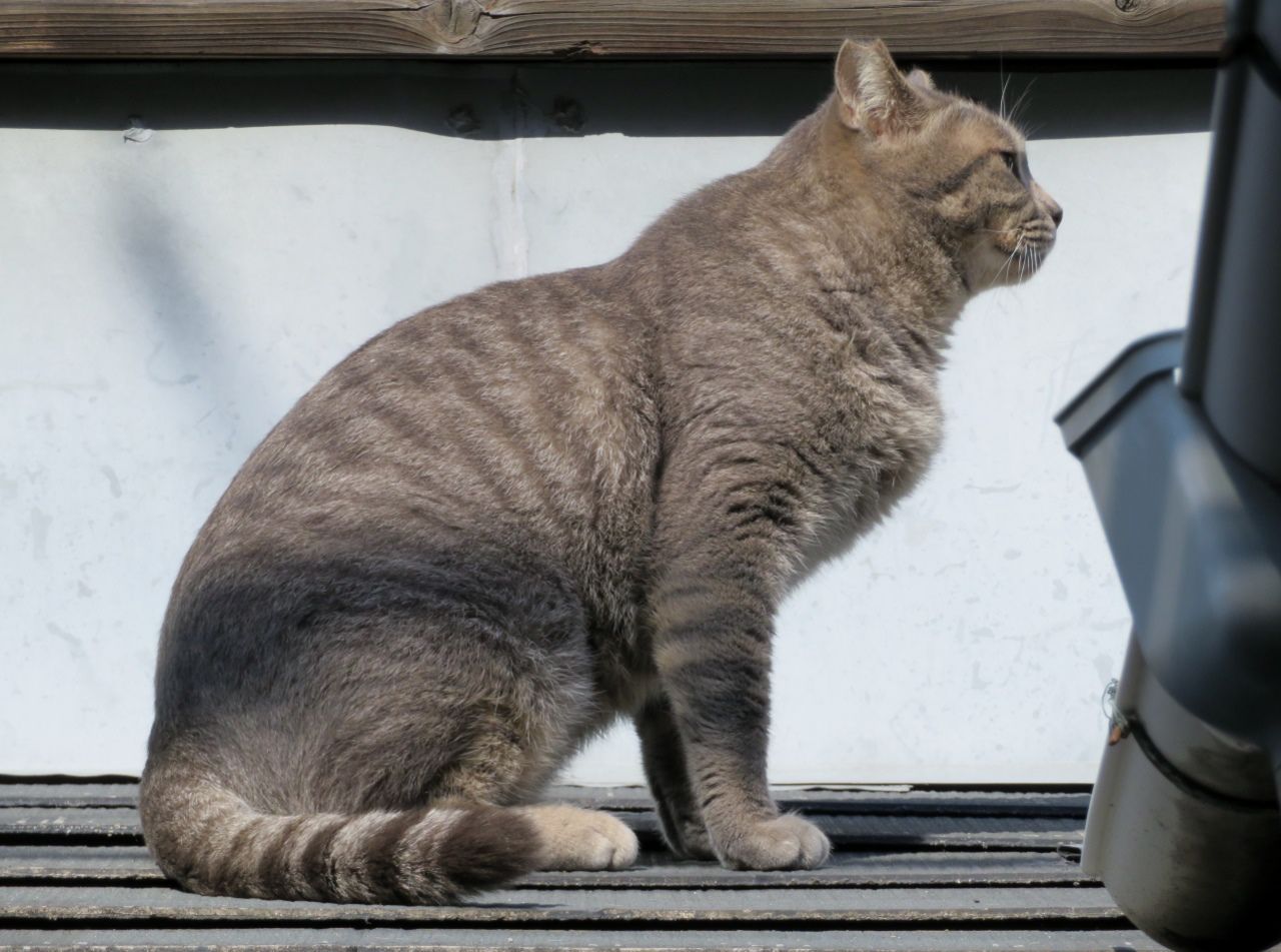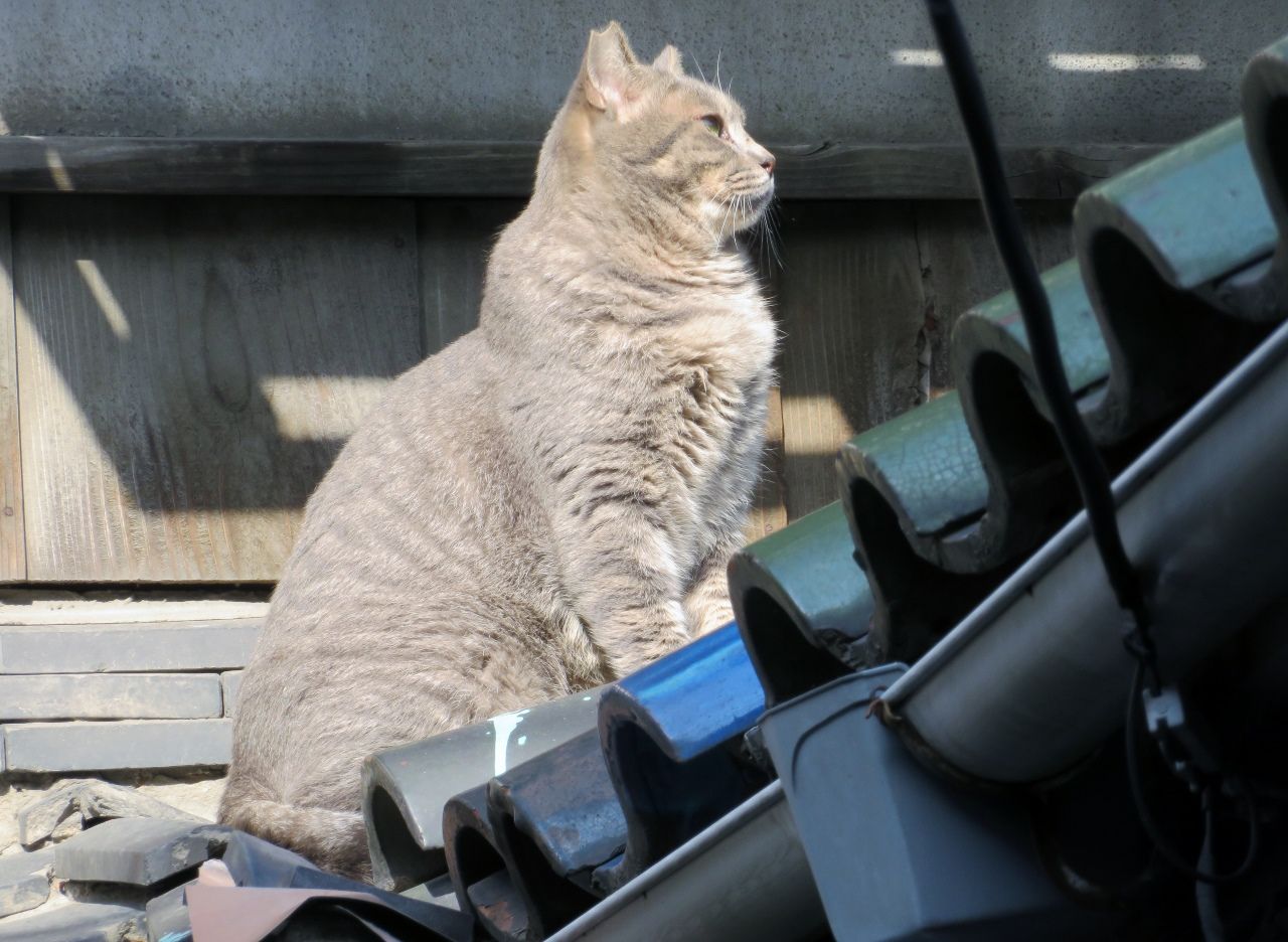 屋根の上で日向ぼっこをしているキジシロを、グレートラが羨ましそうに見ておりました。しばらくの間、おとなしく座っておりました。