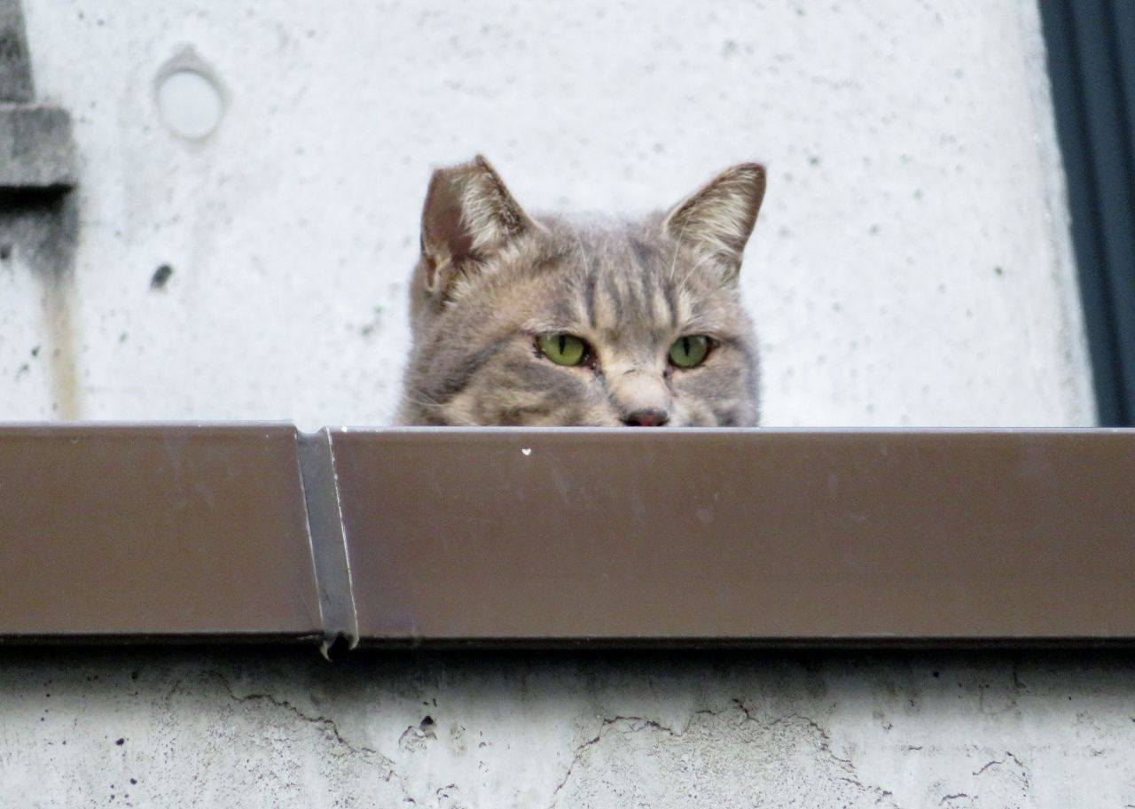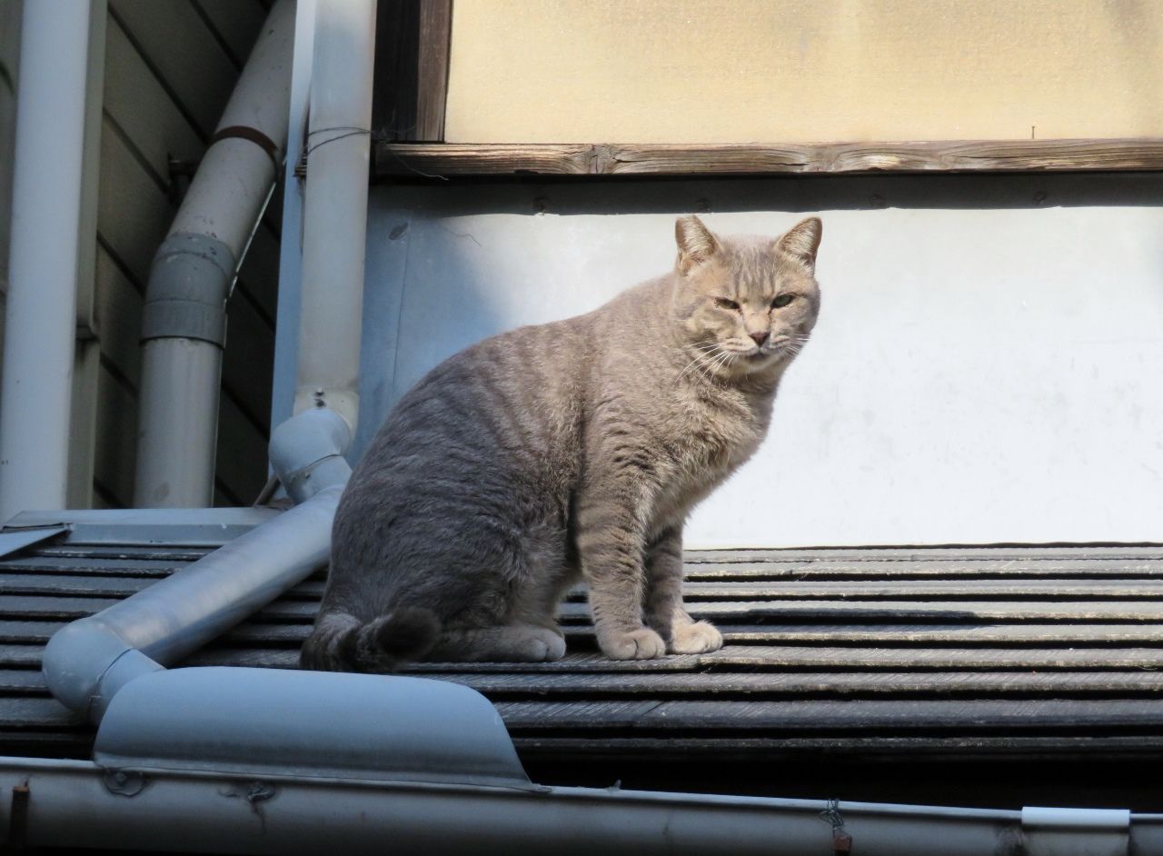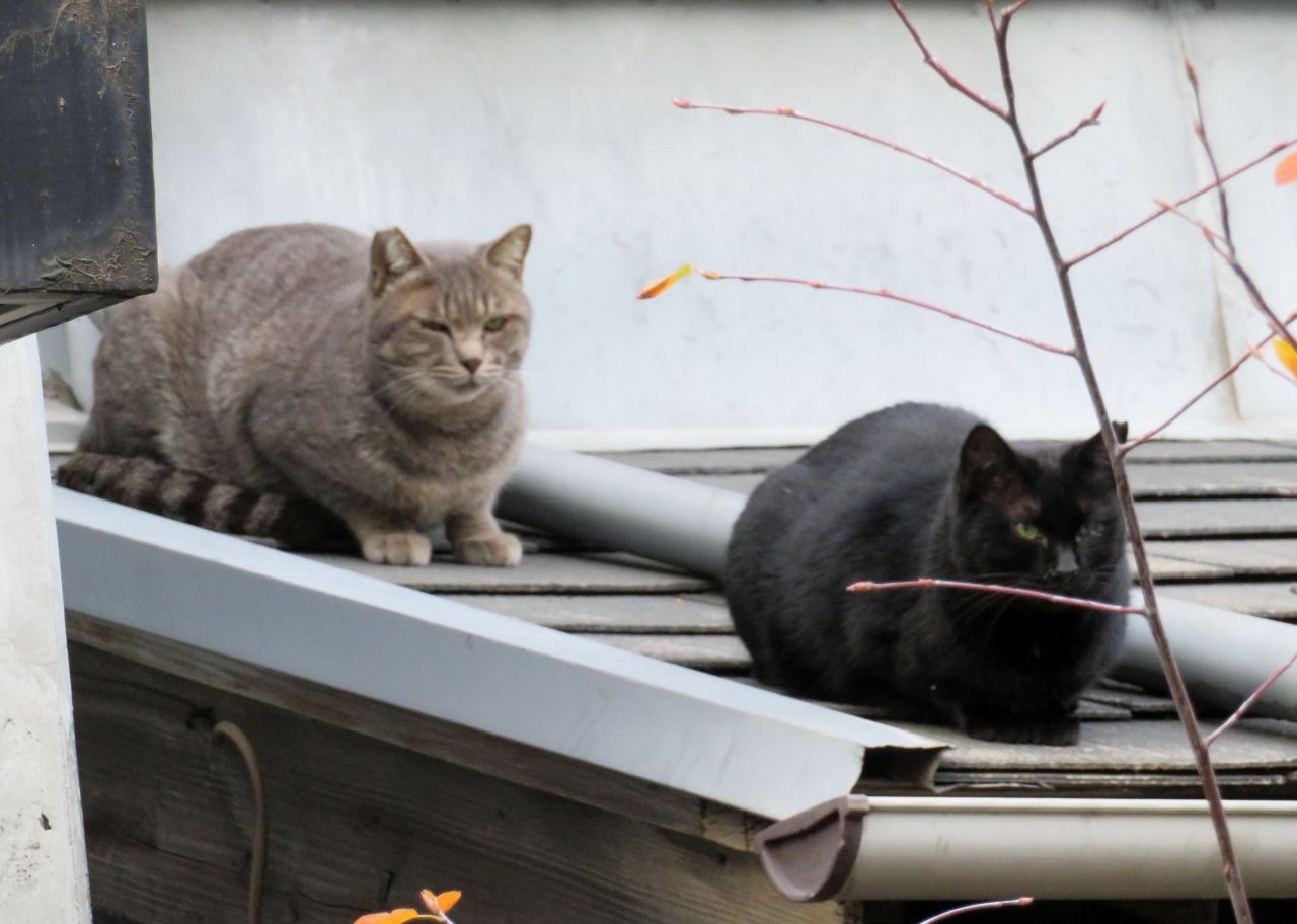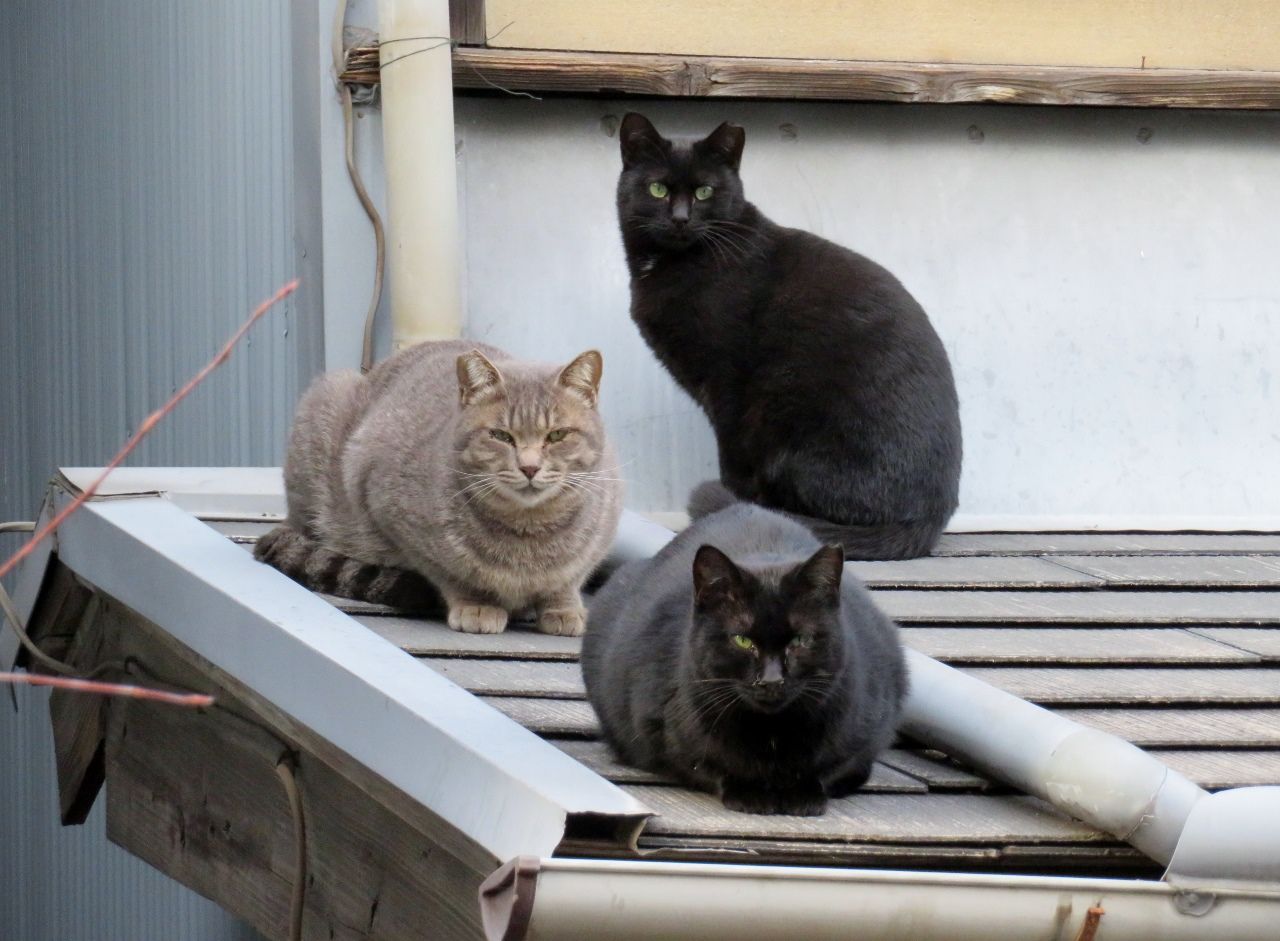 その後、自宅の踊り場(?)からあたりを見張っておりました!?(笑)目が合った時、「フッフッフッ、怪しい奴を見つけたニョだ!」とグレートラが呟いたかどうかは、わかりません!?(笑)見張りをするのに飽きたのか、屋根で丸まっていた黒猫の後ろに飛び移ったので、2匹のネコが一列になってしまいました。そうこうしているうちに、もう1匹黒猫が現れ、見事なスリーショットと相成りました!?(笑)(=^・^=)