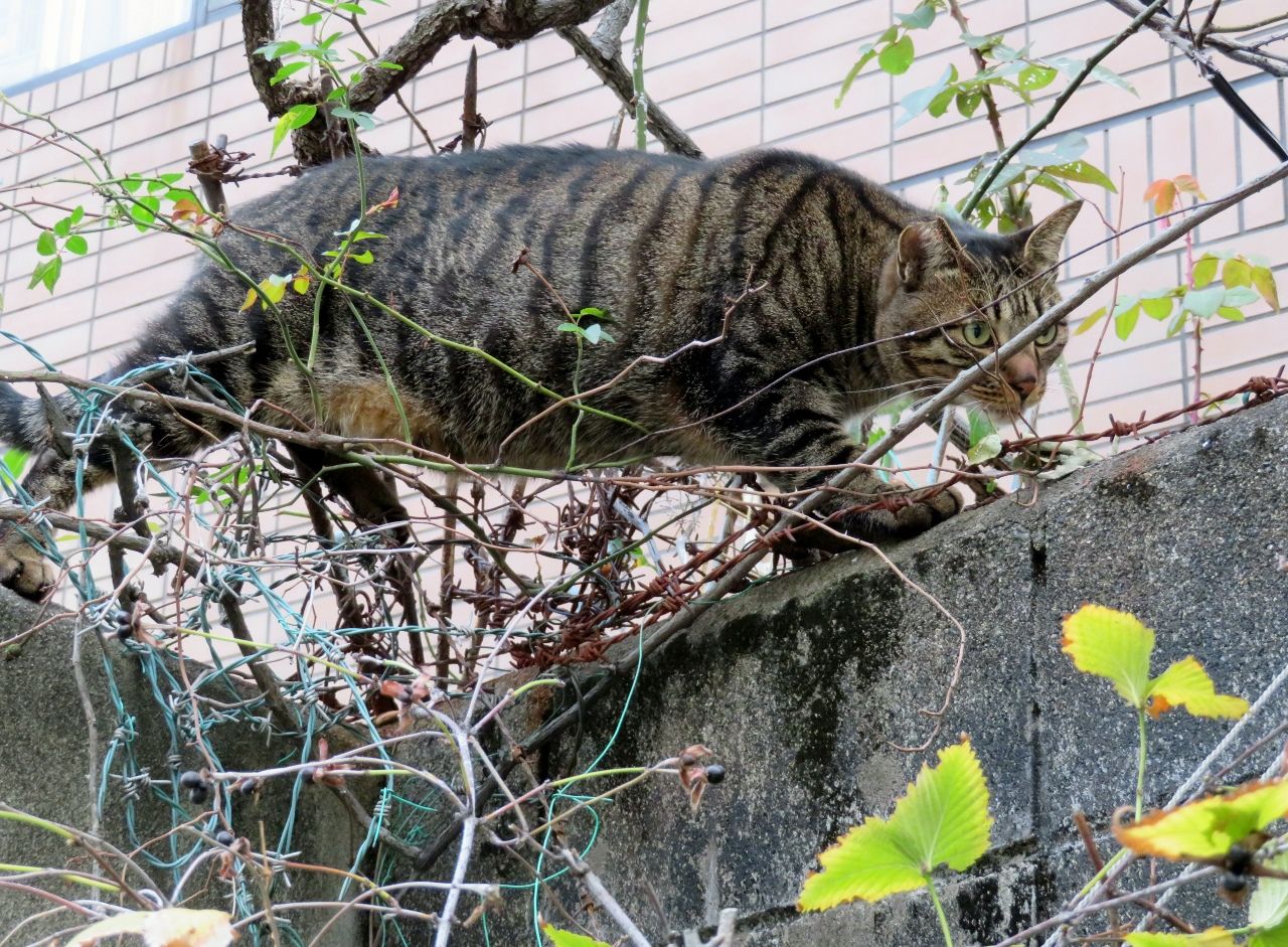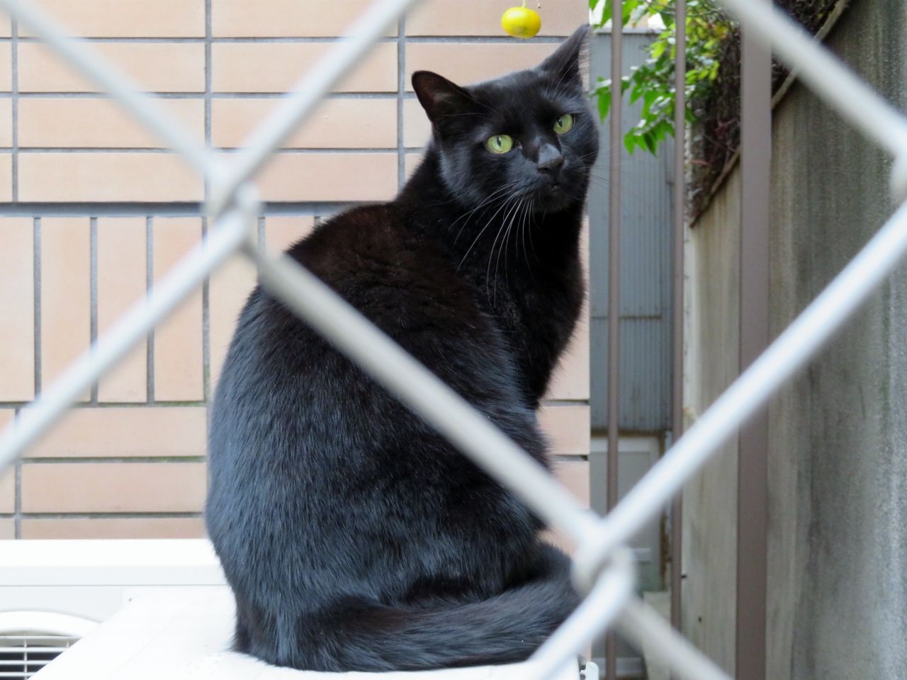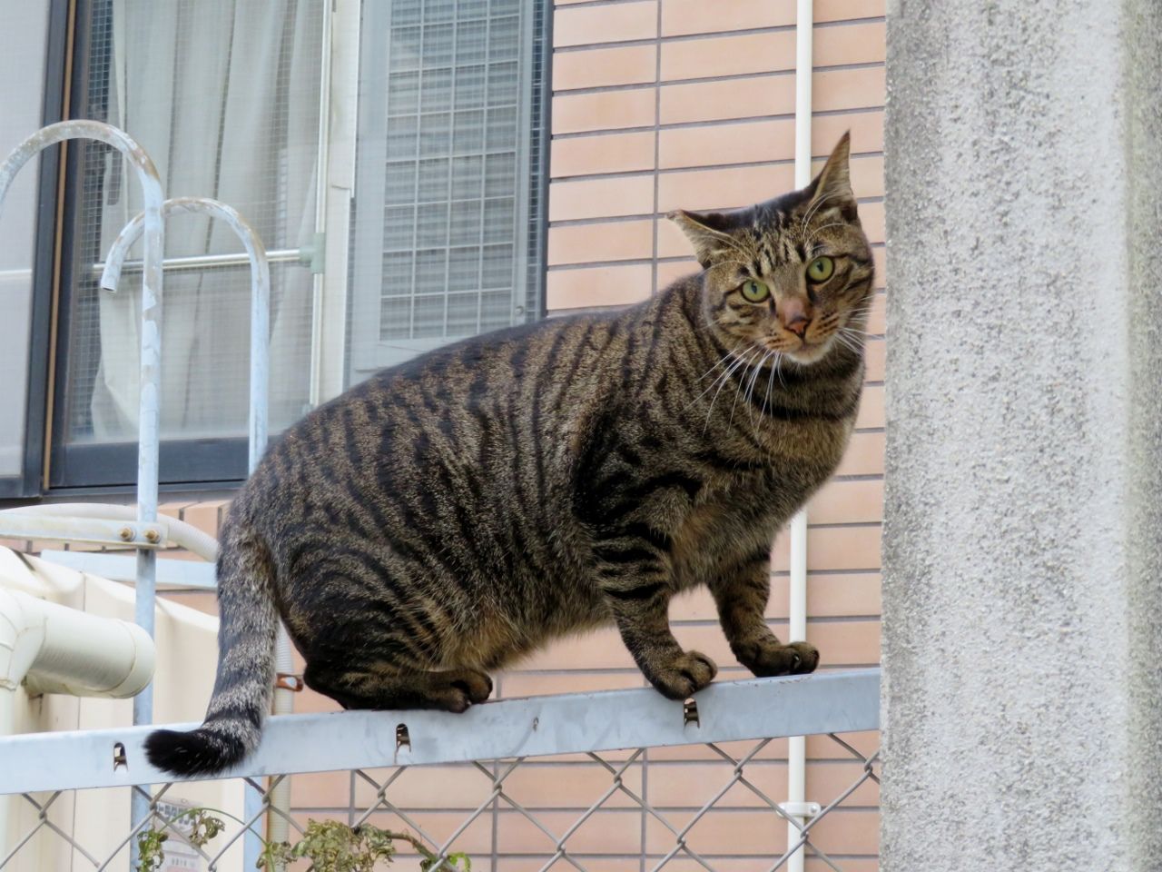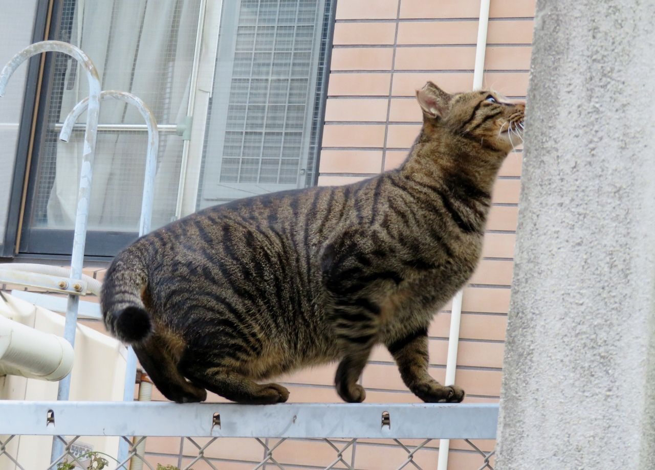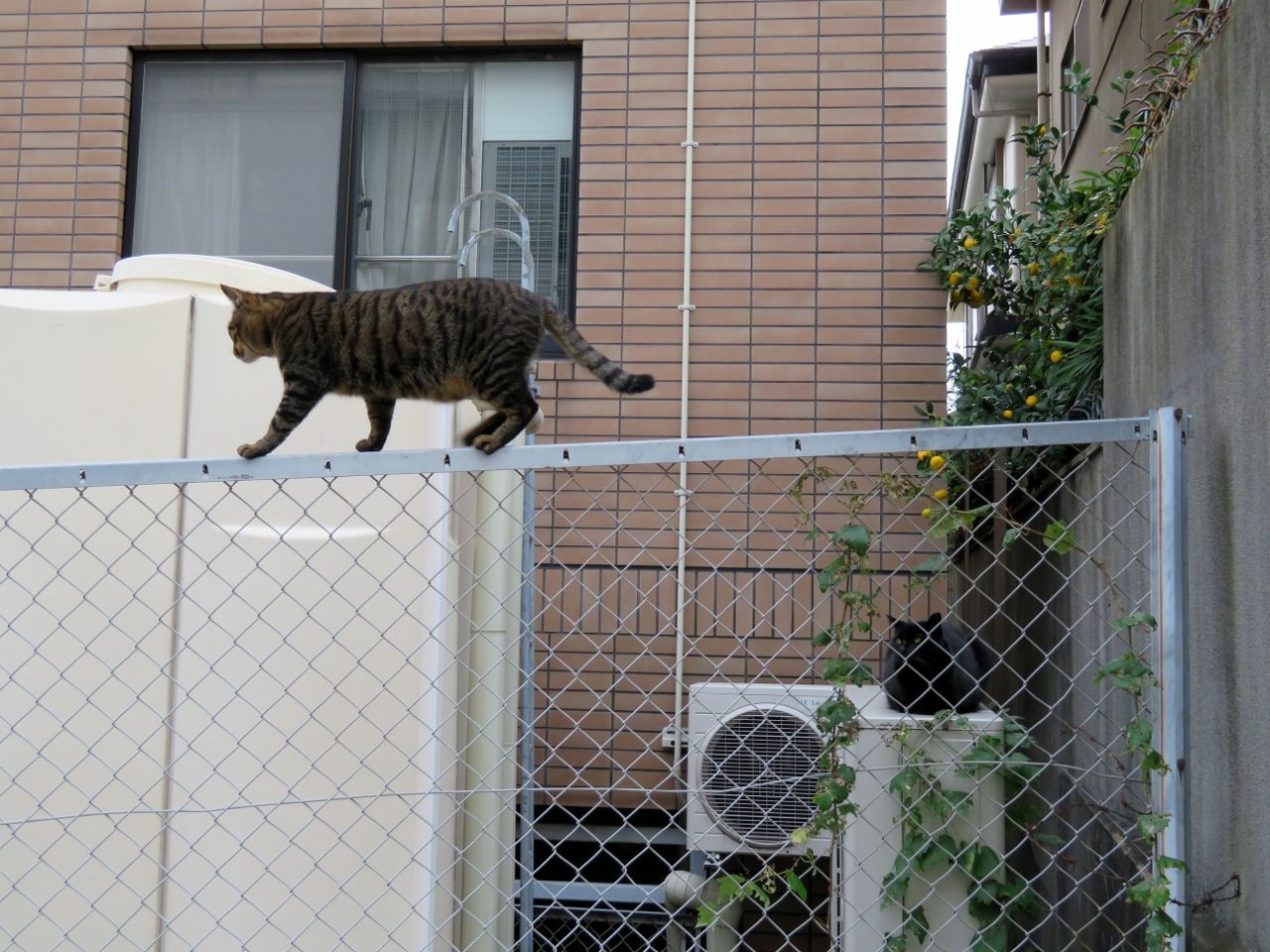 トラが塀の向こうにバサッと跳び下りたのと、入れ替わりに黒猫が塀を乗り越えて、室外機の上に着地しました!?(笑)この黒猫がいたので、トラは跳び下りたのだということがわかりました。再度、トラが塀の上に戻って来たので、鳴き合いにでもなるのかなと思ったのですが、威嚇するわけでもなく、怖がる様子も見せず、フェンスをスタスタ伝って跳び下り、坂道を下って行きました。(=^・^=)