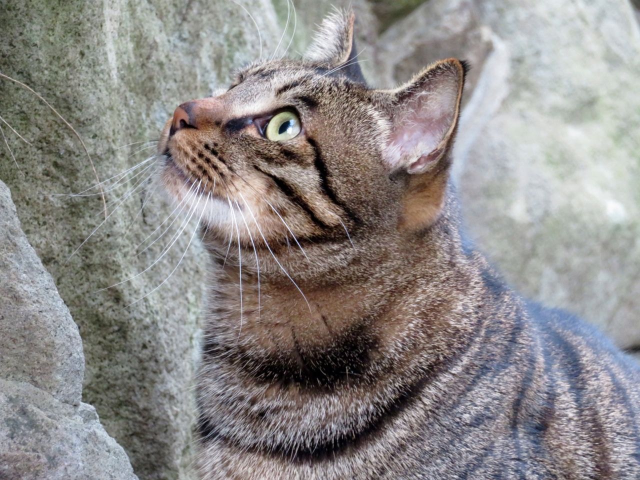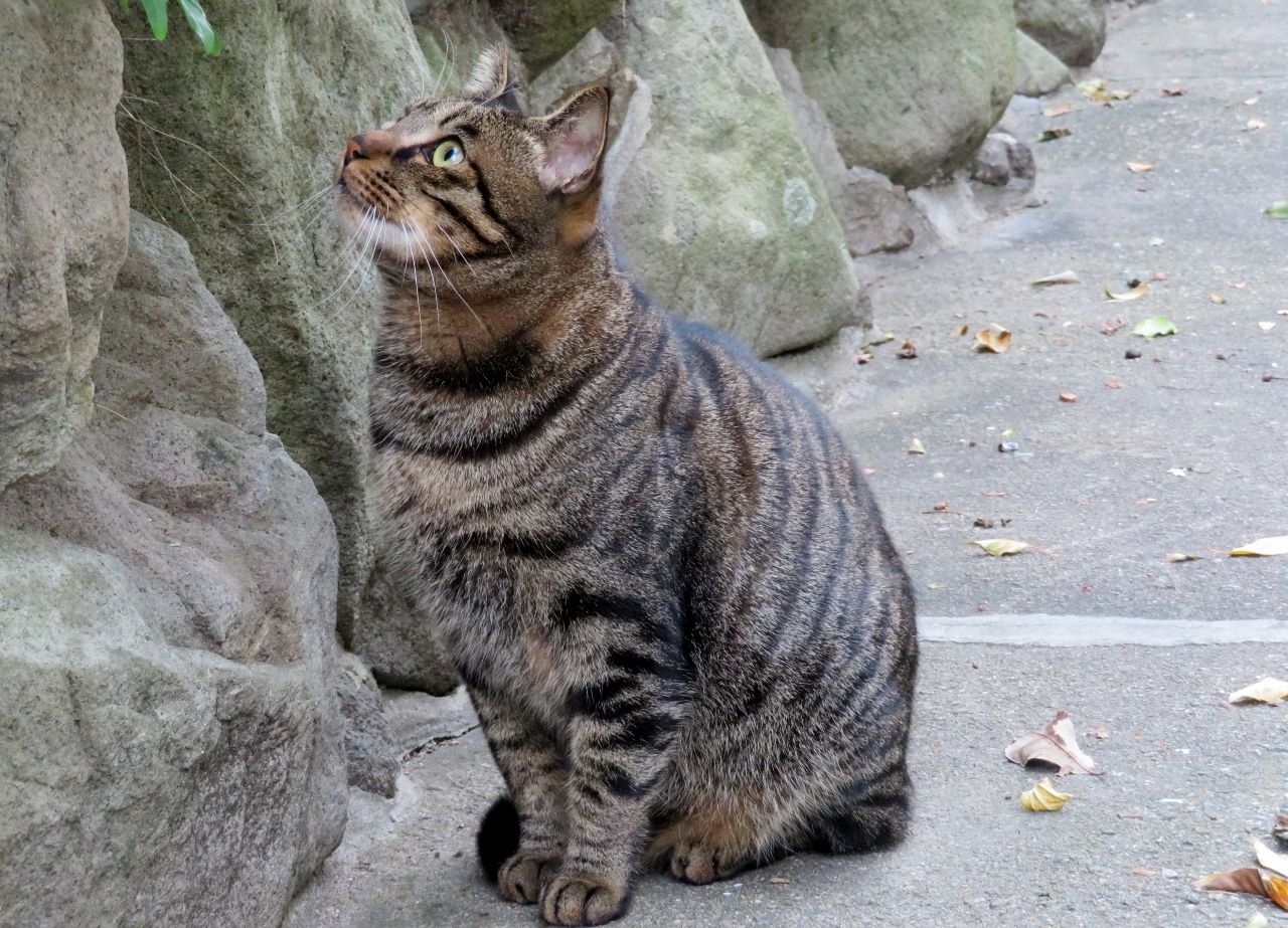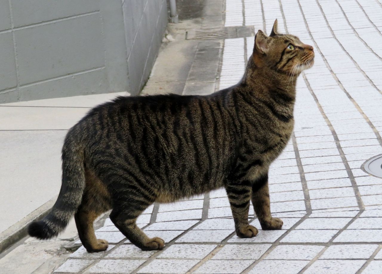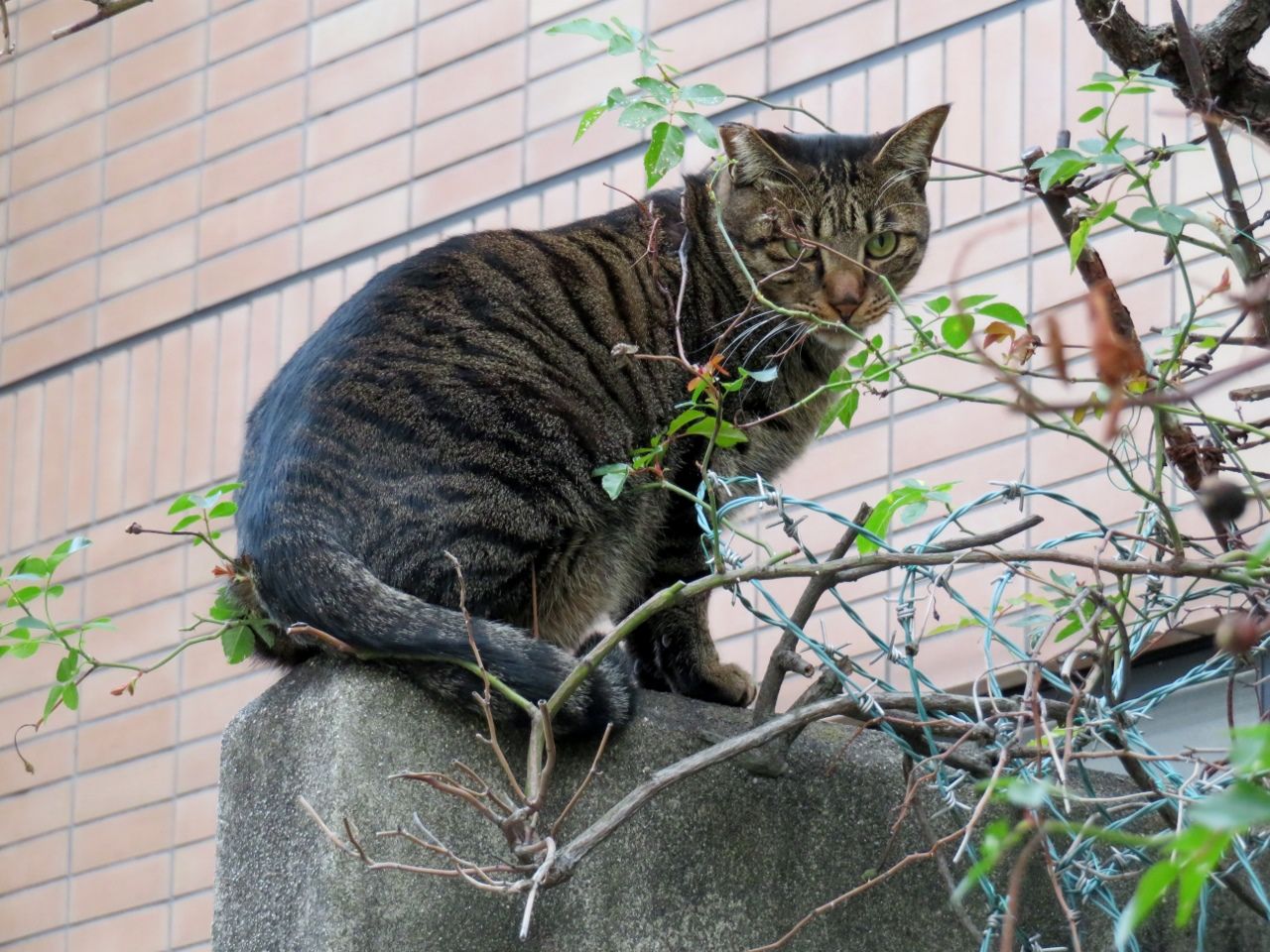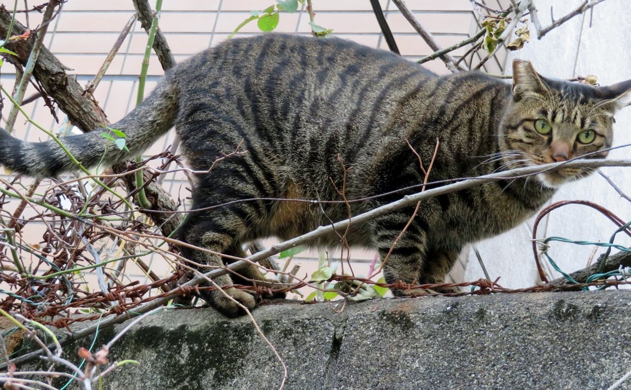 トラが塀の向こうにバサッと跳び下りたのと、入れ替わりに黒猫が塀を乗り越えて、室外機の上に着地しました!?(笑)この黒猫がいたので、トラは跳び下りたのだということがわかりました。再度、トラが塀の上に戻って来たので、鳴き合いにでもなるのかなと思ったのですが、威嚇するわけでもなく、怖がる様子も見せず、フェンスをスタスタ伝って跳び下り、坂道を下って行きました。(=^・^=)