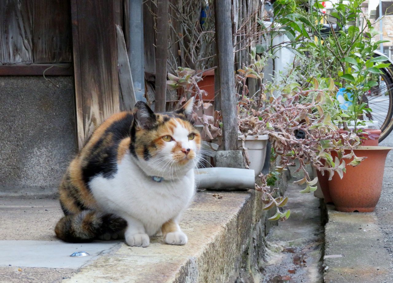 みぃーこがお隣(空き家)の玄関前で、丸まっているところです。茶・黒・白の配色が絶妙な三毛猫だとつくづく思います。(=^・^=)