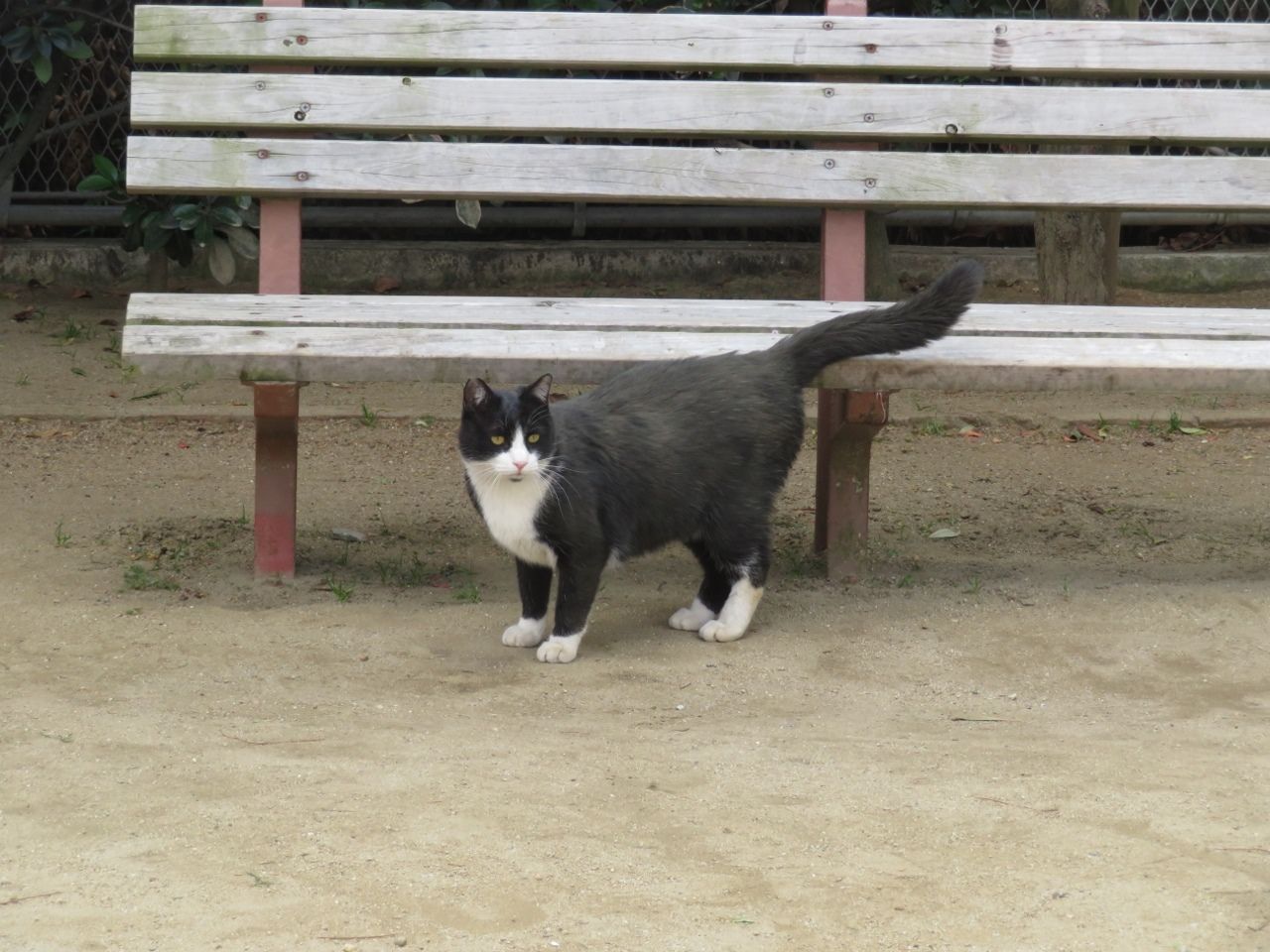 ハチワレが公園の中をしばらく歩き回った後、ベンチに跳びのったところです。