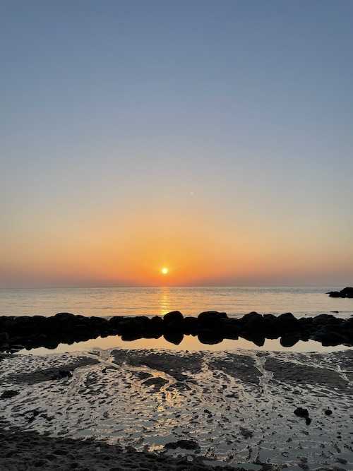 波の音と日の出の太陽の100%の自然の中、自然に流れるままに