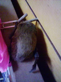 昨日の夜、子供を塾へ迎えに行って帰ってくると階段の暗がりから何か飛んできた何だったかと言うと・・・わかりますか?? コウモリです。うちね。コウモリが住んでるんですよ。いや、うちが洞窟ってわけじゃないけど(笑)中古物件だったのでコウモリの巣がある家を買っちゃったんです。最初は雨戸の戸袋に巣を作っていたんですがコウモリが侵入できないように戸袋に目張りしたら通気口のある壁の空間に引越ししたようで・・ときどき姿を現すんです。明るいところに出てきたコウモリは、目がくらんだ??額縁の上で動かなくなったので「電気を消したら巣にお帰り。猫たちにつかまらないように」声をかけておいたのですが・・・哀れコウモリ朝にはチビちゃんのお土産としてパパの布団の上で発見されましたなむなむところで最近ネコのマーキングがさかんになって困っています。一昨日はパパの風呂敷包み。昨日は私のバッグが被害に遇いました(まだ匂います)こいつが家の周りをうろついてるからだと思うんですが・・・野良猫のイリオモテ今日もチビちゃんはスプレーするようにあちこちにマーキングして回ってます。おしっこでなくて、ローズマリーの香りとかにしてくれたらいいのに