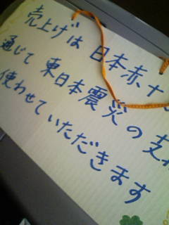 おかげさまで週末のバザーは暑いくらいのお天気に恵まれまして日焼け止めを塗り残した足の甲が赤く日焼けしたくらい実はこのバザーに行く前震災支援をアピールするか?! 悩んだんですよ。団体で支援するならアピールするべきだが個人の支援はフリマに来るお客さんにとっては うさんくさいんじゃないだろうか???それでも支援したい気持ちを共有できる人と出会えるかもしれないってことで・・・こんな小さなプレートを作っていきました。で、これを見た次男は今日の報酬、もしかしたらゼロッ?・・・・良いことよと意外にも賛同してくれた。嬉しくなったので「良いことはね、種をまくのよ。そしたら花が咲くでしょ?」次男に言ったら深イイ~~ ですと(笑)それから閉店に迫ったころ見たところ40歳くらいの男性が「震災にいくから」と私の作った手作りバッグを手にとってくれたんです。震災にいく?! ボランティアで被災地に行くのか???疑問に思って話をしてみると「僕ね、宮城出身なんです。このバッグ、震災にいく(震災支援にまわる)んでしょ? 実家が被災して母が亡くなったけど・・・仕方ないですよ。 もう四十九日も済みましたしね。立ち直りました。バッグ買います!」一瞬 言葉に詰まりました。肉親を亡くした悲しみは日が経つほどに深くなるというし四十九日まではなんとか気を張っていられるもの。これからの彼の心の脱力感を想像したら、どんな言葉をかけてよいのか???「それはお気の毒でした。けど、頑張ってください」 とやっとの思いで実際支援だからといって買ってくれたのはその男性一人でしたがたった一人でも気持ちを共有できてよかったかな