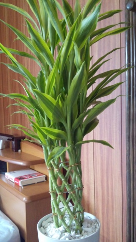 風が強くなってきました。昨日今日のわが家風水が良いか悪いかは分かりませんがほかに思いつくこともないので、続投することにしました週末に模様替えした次男の部屋。机の位置を優先させたため、枕の位置が気になっていました。なんでも部屋のドアを開けてすぐ枕が見えるのは凶とか。ま、気にしなければいいのですが気にしないでおこうとすると余計気になるそうだ、観葉植物だ。観葉植物でカバーしよう!!!植物は悪い気を吸収してくれるらしい。それにホームセンターに並ぶ鉢植えを想像しただけで私の心はすでに鉢植えを選びはじめていたし(笑)車の中ではカラーにしようと思っていました。カラーのカラーは白!白のカラーっていかにも清純で潔白って感じしないですか??う〇こ疑惑だのコン〇ーム所持だの汚れきった次男の身を清めるにはカラーしかないと思いました。ところがね~白のカラーは売り切れピンクと黄色はあったけどカラーはやっぱり白でないと困る。カラーの代わりを見つけるのに相当悩みましたが・・・「開運を招きます」の言葉にあっさりつられてミリオンバンブーに(笑)次男が 竹のように真っ直ぐの心で伸びてくれるように・・・ん、このバンブー、真っ直ぐじゃないよね?しかも、ねじくれてるし!オーマイブッダ